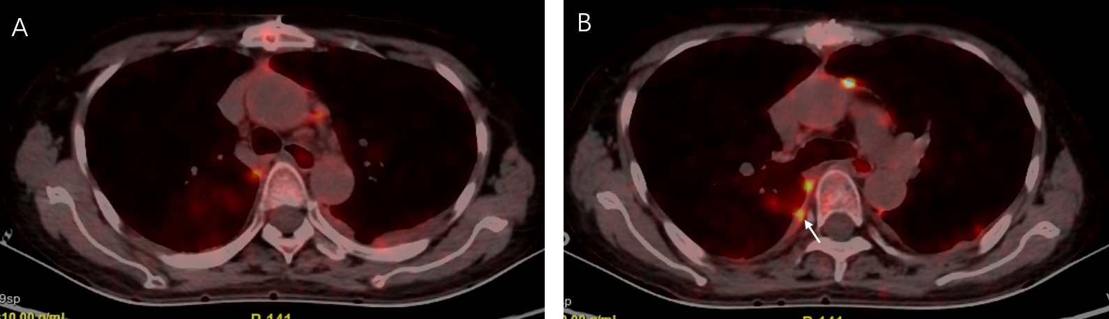 The patient was referred to our respiratory department for unexplained pleural effusion and dyspnea. In view of the patient’s history, we believed that both pleural metastases and pleuro-specific infection should be considered. PETCT was performed and showed multiple pleural thickening, and metabolic activity was found bilaterally with a maximum standard uptake value of 12.5 (Figure 2).