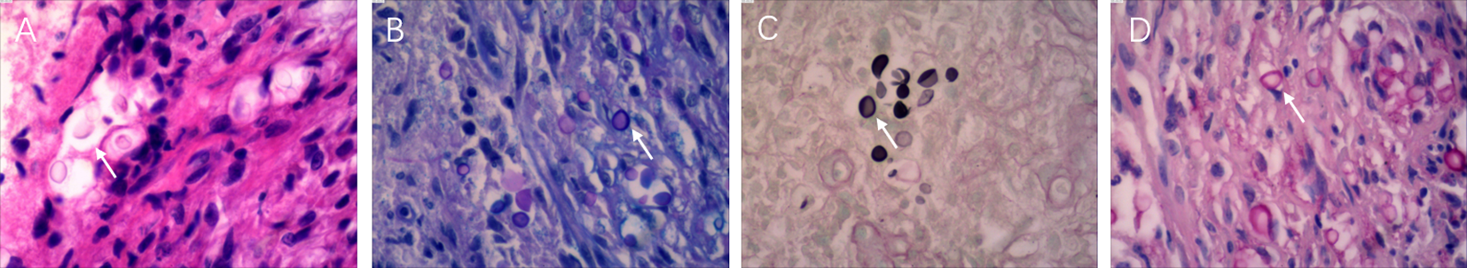 Pathological examination of pleural tissue revealed fungal bodies, which were numerous yeastlike organisms surrounded by mucinous capsules and were between mesothelial cells and histiocytes (A–D), white arrow. Stained by hematoxylin and eosin (A), AB-PAS (B), hexamine silver (C), and mucicarmine (D).