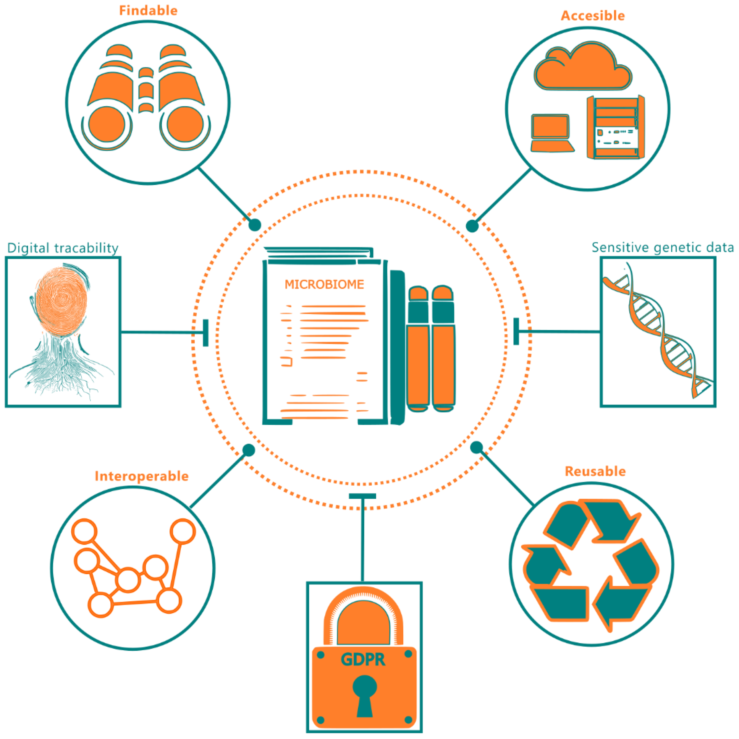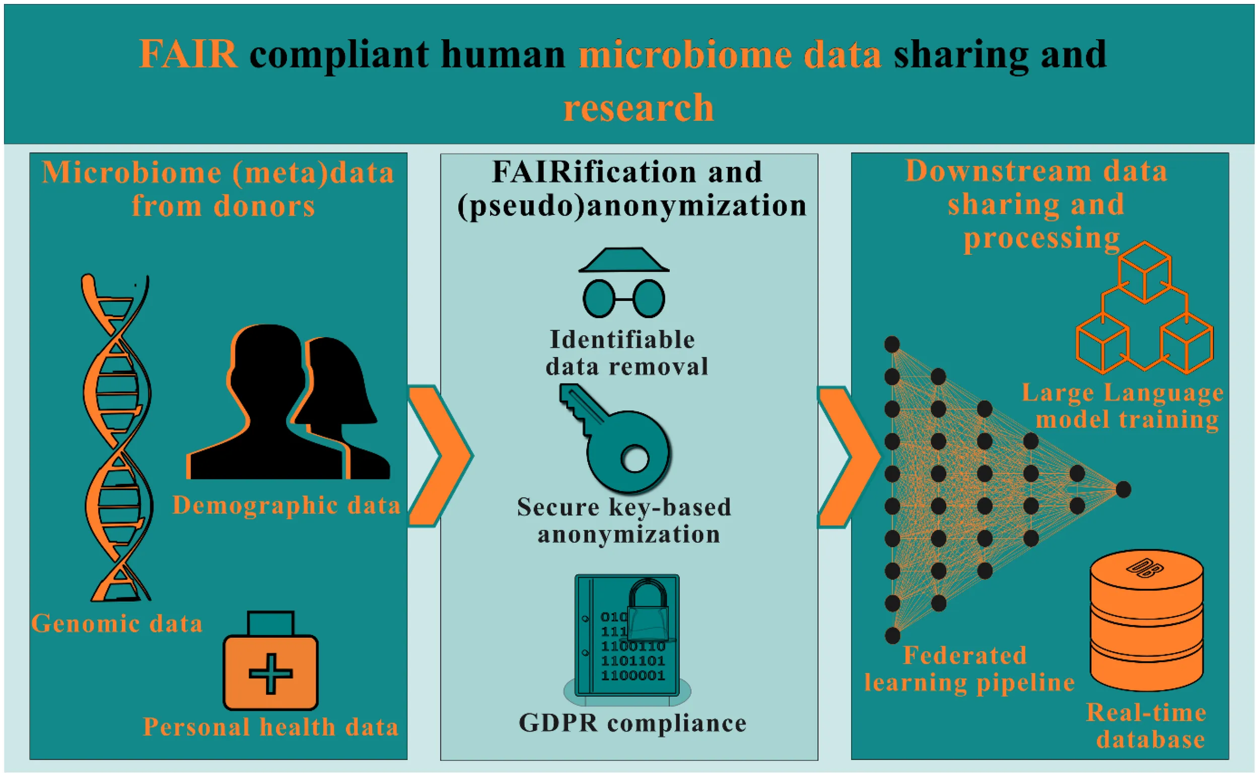 Here, the focus is on application of the FAIR principles to human microbiome research. “Microbiome data” refers to the genetic material that is collected and analyzed from a community of microorganisms, such as bacteria, viruses, fungi, and other microbes, that live in a specific environment. Techniques such as microbiome shotgun sequencing is one of the methods to generate microbiome data. This involves breaking down the genetic material from all the microorganisms in a sample into small fragments, or reads. By comparing these reads to reference databases, researchers can identify and quantify the different microorganisms present in the sample, as well as determine the functions of the genes that are present. When looking at microbiome data, for which, in this case, the microbiome will be defined according to Berg et al. (2020) as “all of the microbial components in a given ecosystem or plant, animal or human system”, a few issues arise with FAIR compliance. There are microbiome databases such as National Microbiome Data Collaborative (NMDC) (The National Microbiome Data Collaborative Data Portal: an integrated multi-omics microbiome data resource, 2022) that focus on providing a FAIR-adherent platform for storage of microbiome meta data. Microbiome data from non-human systems, such as plant-associated or aquatic ecosystems, which are not bound by intellectual property (IP) and ethical considerations, could be readily uploaded to these platforms with minimal filtering or data clean-up. However, the microbiome (meta)data derived from humans, contains highly confidential information such as fragments of human DNA. Consequently, it is not permissible to disclose this data to the general public (Irving and Clarke, 2019). If this pseudonymized or anonymized data were to be made public and combined with the metadata of the dataset, which includes information regarding for example the age, sex and (approximate) location of the donor, it could lead to an intrusion on the privacy of the donor, thus violating the GDPR (Gürsoy et al., 2022). To enable open data publications, human (host) DNA data scrubbing tools have been proposed. However, such tools do not remove all human host DNA. Additionally, during this process, the tools may incorrectly remove some non-host DNA data. Bad actors could potentially use this partly scrubbed datasets and their derivatives to orchestrate serious privacy violations. For example, the identity of the donor could be derivable, and private medical information could be traceable, such as possible health risks and genetic mutations (Irving and Clarke, 2019).