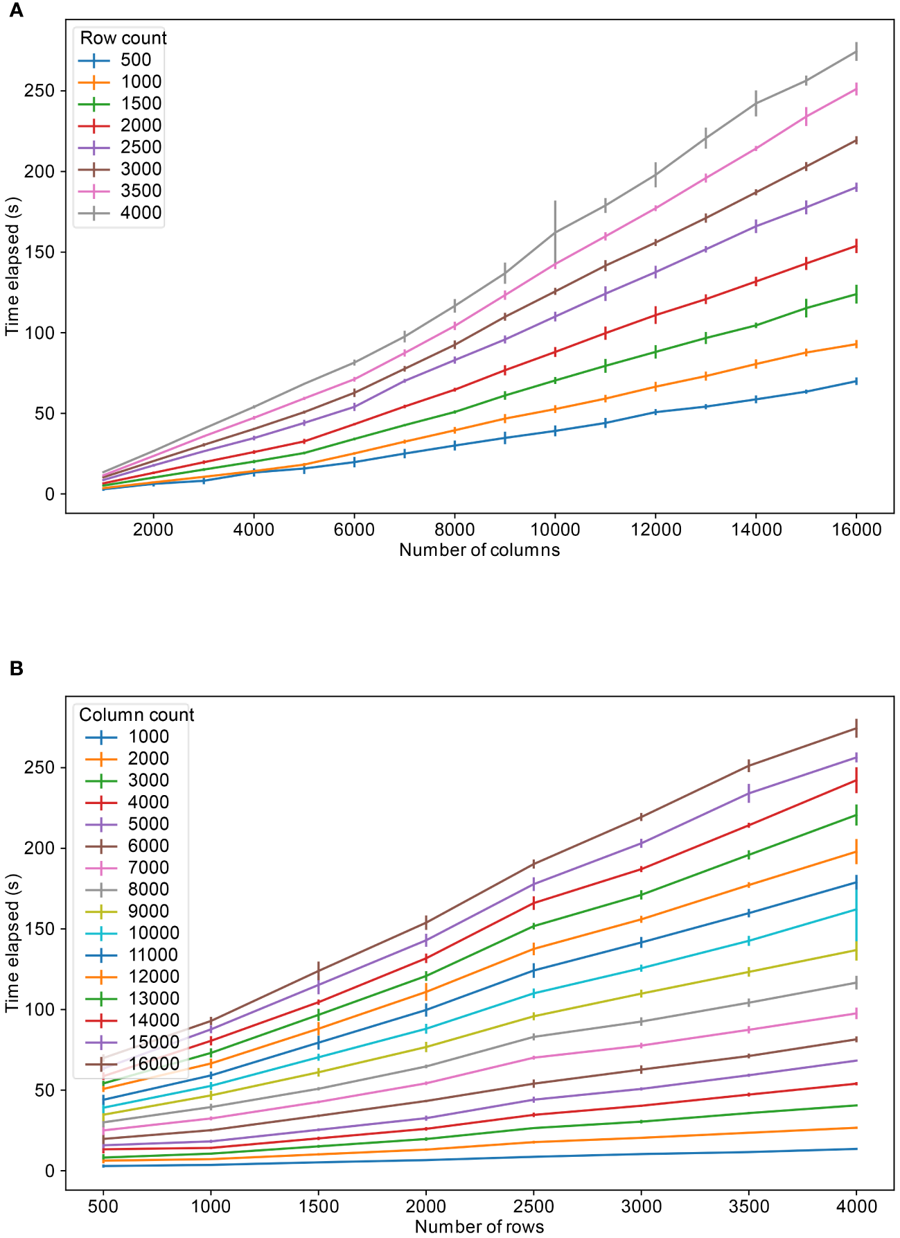 The database developed in this work was tested for its throughput capabilities. To carry out the tests, we generated CSV files containing values with various number of rows and columns. The synthetic data was generated to closely resemble the count matrices in microbiome data. The data upload results show that uploading a file to the database is mostly a linear relation with regards to the number of rows and columns (Figure 3).