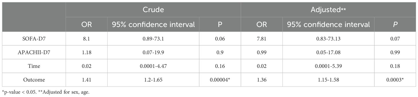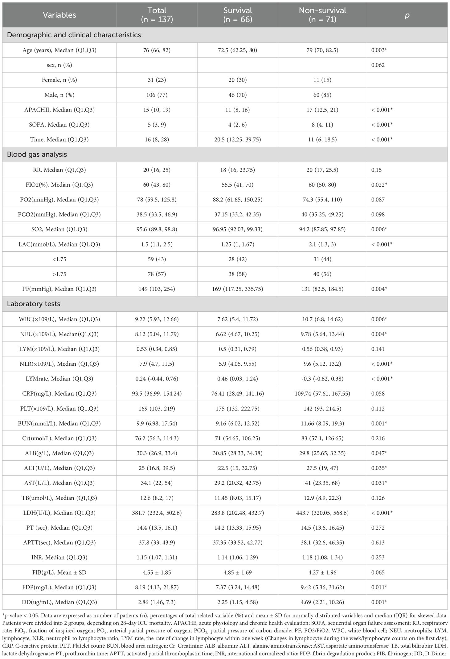 The basic data from 168 ICU patients were processed, and after excluding patients with incomplete data, a total of 137 patients were included for analysis in the present study. The total number and proportions were used to represent categorical variables. For normally distributed variables, the data were expressed as mean and standard deviation (SD), while skewed data were expressed as median and interquartile range (Q1–Q3). The Chi-squared or Fisher’s exact test was used to compare the categorical variables, the student’s t-test was used to compare the normally distributed continuous variables, the Mann-Whitney U test was used to compare the skewed continuous variables, and multiple regression was selected to characterize the relationship between clinical indicators and primary outcomes. Baseline variables which were clinically relevant or had a univariate relationship with prognosis, such as age, fraction of inspired oxygen (FiO2), LAC level, white blood cell (WBC) count, NEU count, NLR, LDH, D-dimer (DD) level, fibrinogen degradation product (FDP), and APACHE II and SOFA scores, were entered into the multivariate logistic regression model as covariates. The receiver operating characteristic (ROC) curve and the area under the curve (AUC) were calculated to evaluate and compare the diagnostic performance of each parameter. A restricted cubic spline (RCS) was used to predict the relationship between LAC level and event risk, and the inflection point was set as the cut-off point. Stratified based on the LAC cut-off value in the ROC curve, the relationship of LAC level with associated factors, including APACHE II and SOFA scores on the seventh day as well as hospitalization time, was evaluated using the Cox proportional risk model, with covariates adjusted for sex and age for each model. We created a survival curve stratified based on LAC values, after which we conducted a causal mediation analysis (CMA) to determine whether other clinical indicators changed the relationship between LAC level and clinical outcomes. For this, we determined which indicators were simultaneously related to LAC level and clinical outcomes, and the shortlisted indicator, NLR, was subjected to CMA as described by previous studies (Huang and Yang, 2017; Choy et al., 2023), as an instrumental variable, with LAC level as the independent variable and clinical outcomes as the dependent variable. Statistical analyses were performed using R software version 4.2.0. (R Foundation for Statistical Computing) with statistical significance set at P < 0.05.
