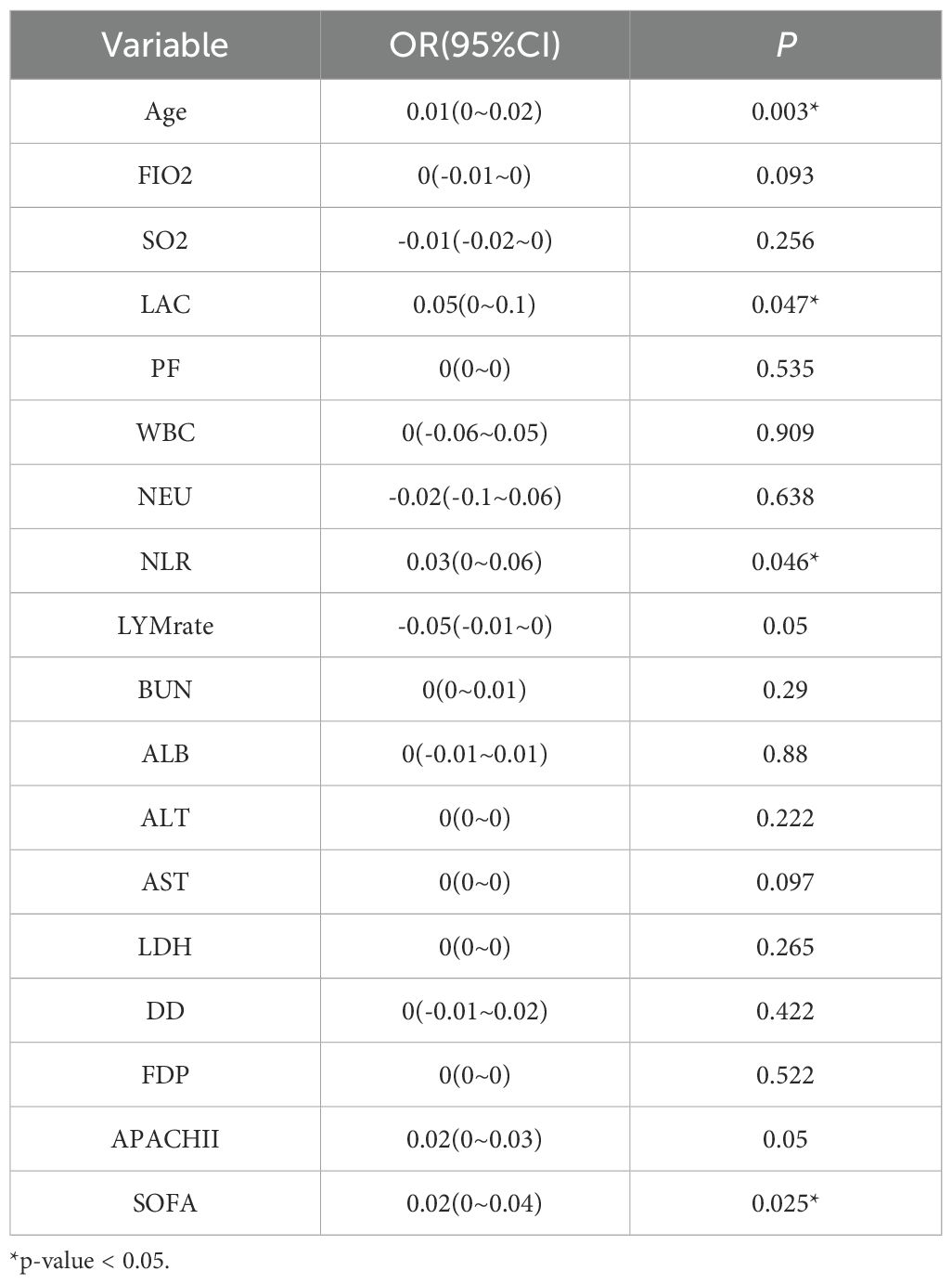 A total of 137 patients were included in the present study, 77.40% of whom were male, with an average age of 72.7 years. The mortality rate was 51.8%, with the majority of deaths being men (84.5%), and the average length of stay in the ICU was 20 days. The age of the deceased patients, as well as their APACHE II and SOFA scores on the day of ICU admission were significantly higher than those of the surviving patients, although their hospitalization time was shorter. FIO2, LAC level, WBC count, NEU count, NLR, blood urea nitrogen (BUN), aspartate aminotransferase (AST), alanine aminotransferase (ALT), LDH, FDP, and DD in the deceased patients were significantly higher (P < 0.05), while their albumin levels were significantly lower (P = 0.047) than those in the surviving patients (Table 1). The LYM count in the surviving patients showed a statistically significant upward trend within one week of ICU admission (P < 0.001). Multivariate regression analysis showed that age, LAC level, NLR, and SOFA score were significantly associated with the patients’ prognoses (P < 0.05) (Table 2).