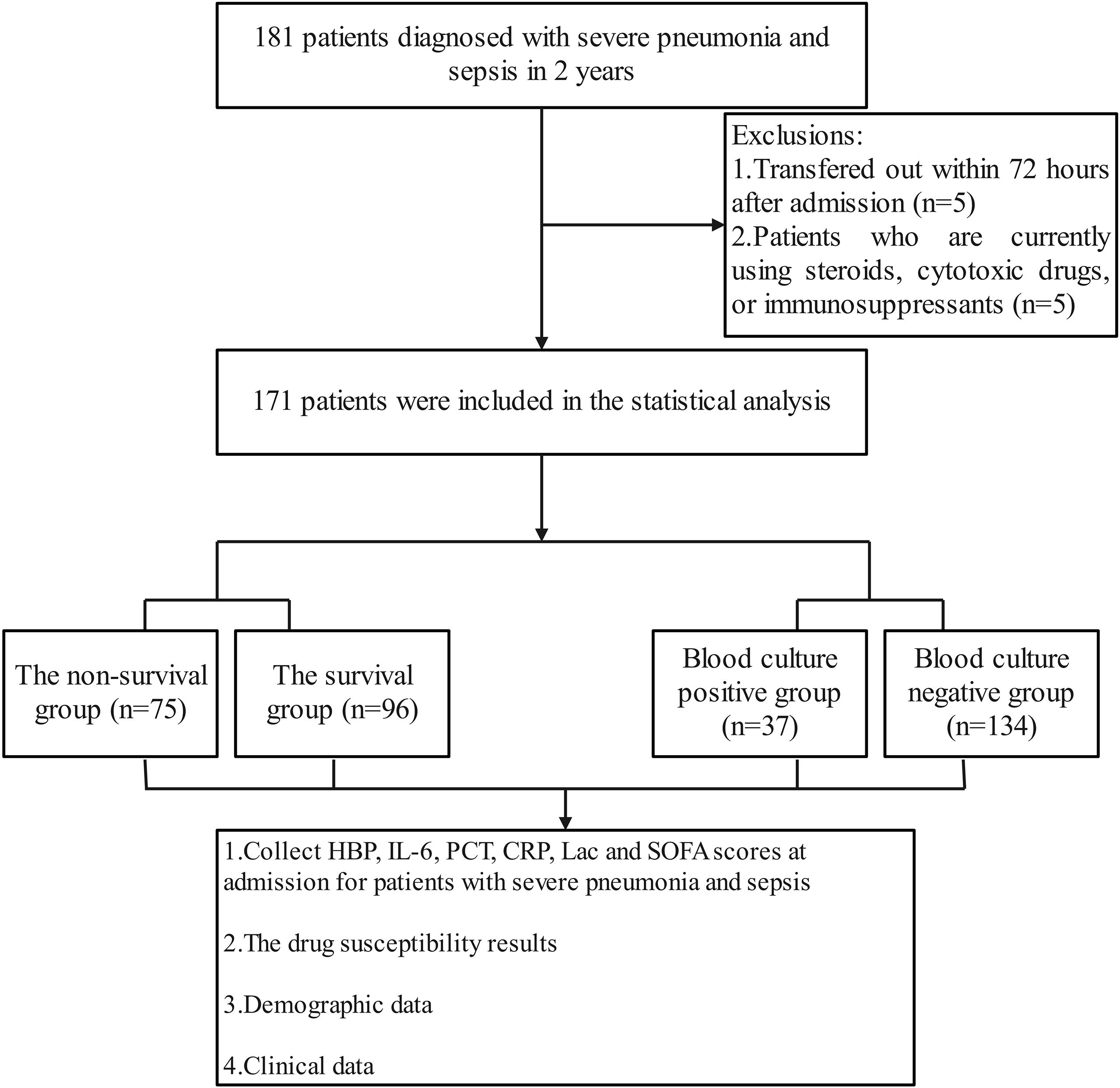 Figure 1. Flow chart for patient selection. A total of 181 patients with severe pneumonia and sepsis were analyzed. After excluding 10 patients, 171 patients were included for clinical data analysis.