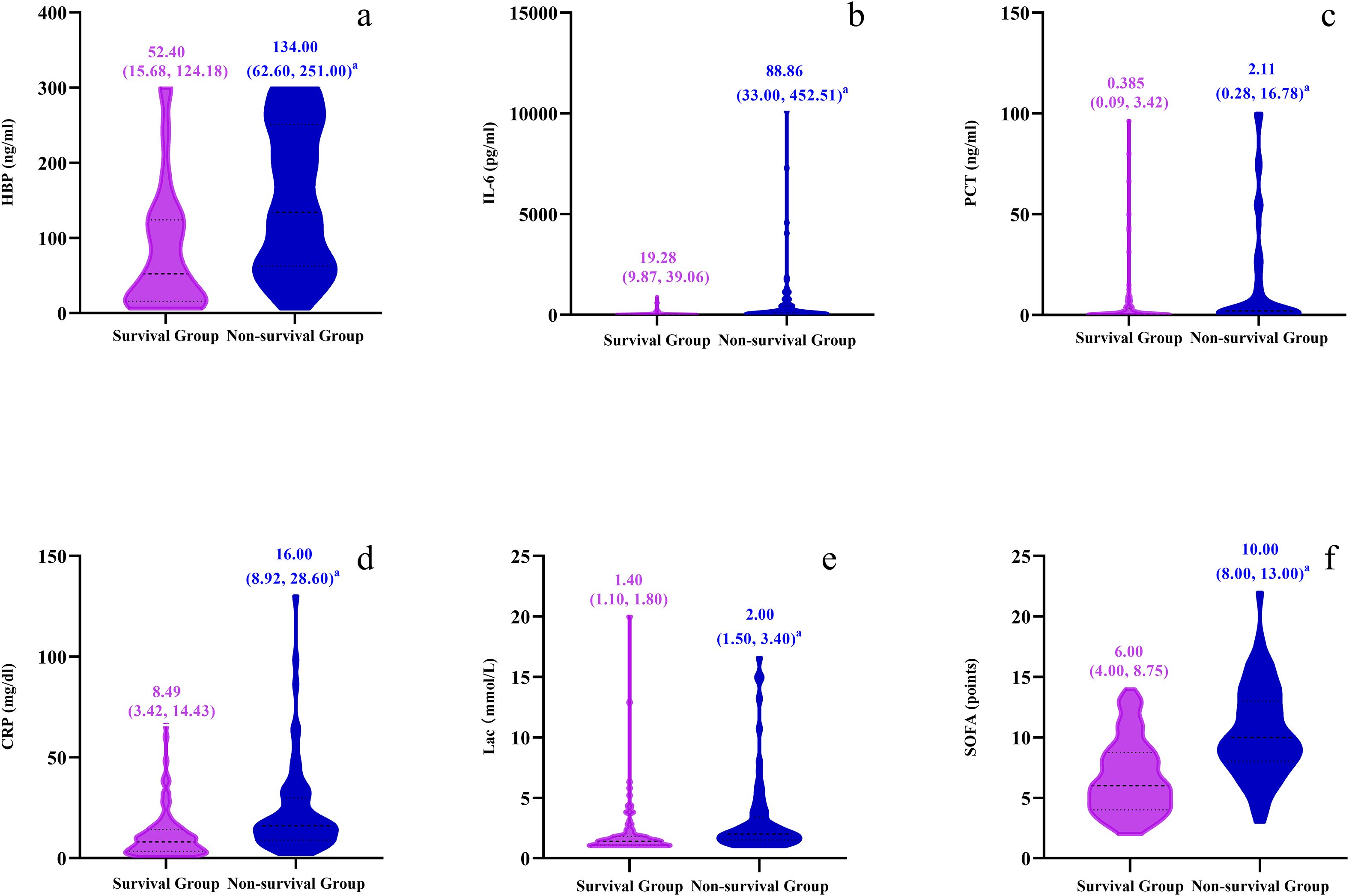 Figure 2. Violin plots compare survival and non-survival groups across six parameters: (a) HBP (ng/ml), (b) IL-6 (pg/ml), (c) PCT (ng/ml), (d) CRP (mg/dl), (e) Lac (mmol/L), and (f) SOFA points. Plots display median values and interquartile ranges.