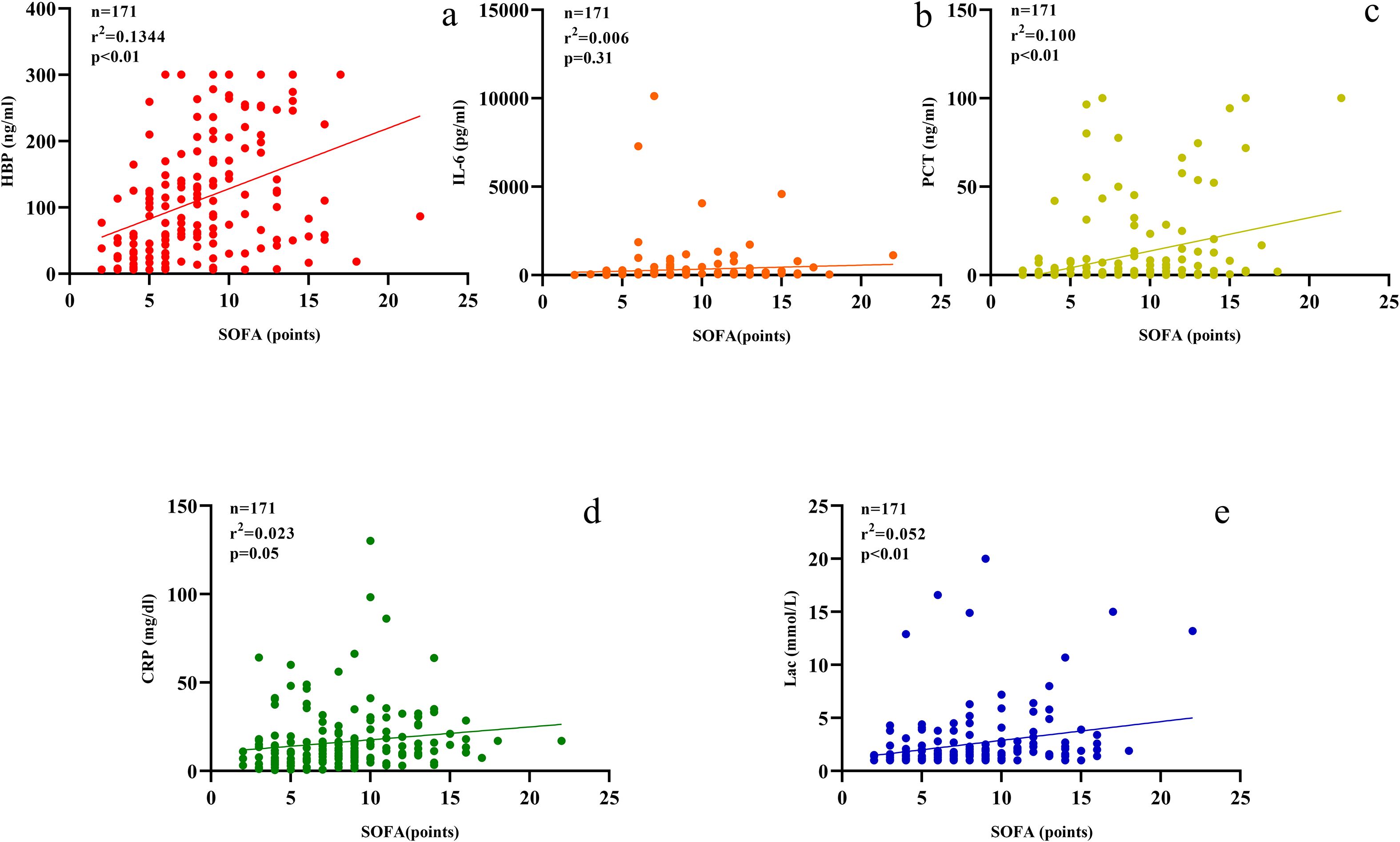 Figure 3. Scatter plots (a–e) display relationships between SOFA scores and various biomarkers. (a) HBP; (b) IL-6; (c) PCT; (d) CRP; (e) Lactate. Each plot includes sample size, r-squared, and p-values.
