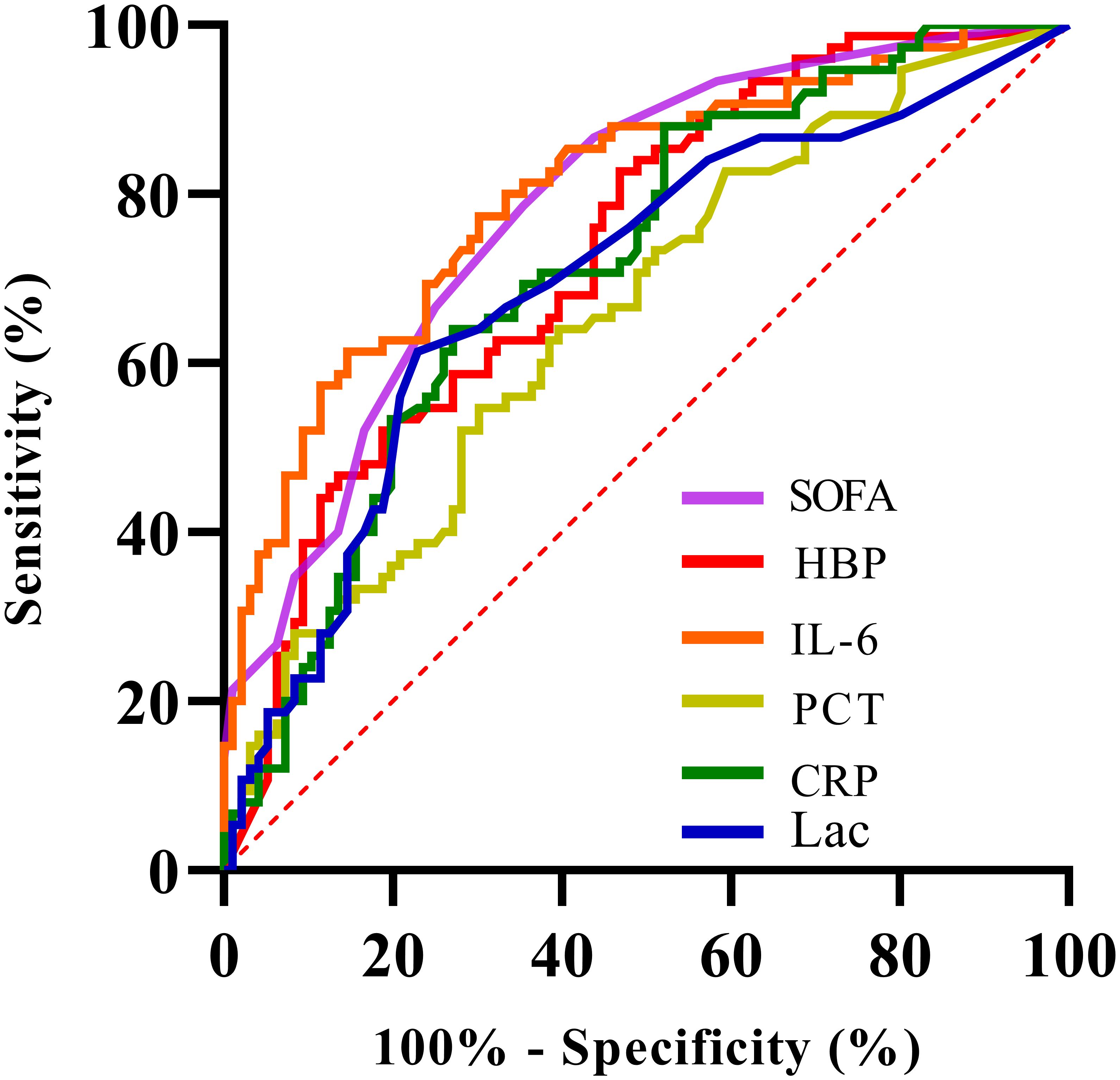 The Delong test was used to conduct pairwise comparisons of the AUC values for each indicator: 1. The AUC of IL-6 was significantly higher than that of PCT (Z = 3.277, P = 0.001 < 0.05), Lac (Z = 2.169, P = 0.03 < 0.05), but there was no significant difference compared with CRP (Z = 1.867, P = 0.062 > 0.05), HBP (Z = 1.367, P = 0.172 > 0.05), and SOFA score (Z = 0.360, P = 0.719 > 0.05). 2. The AUC of HBP was not significantly different from CRP (Z = 0.316, P = 0.752 > 0.05), Lac (Z = 0.615, P = 0.515 > 0.05), IL-6 (Z = -1.367, P = 0.172 > 0.05), PCT (Z = 1.358, P = 0.174 > 0.05), and SOFA score (Z = -1.209, P = 0.227 > 0.05). There was no significant difference in the AUC comparisons among CRP, Lac, and PCT (all P > 0.05).