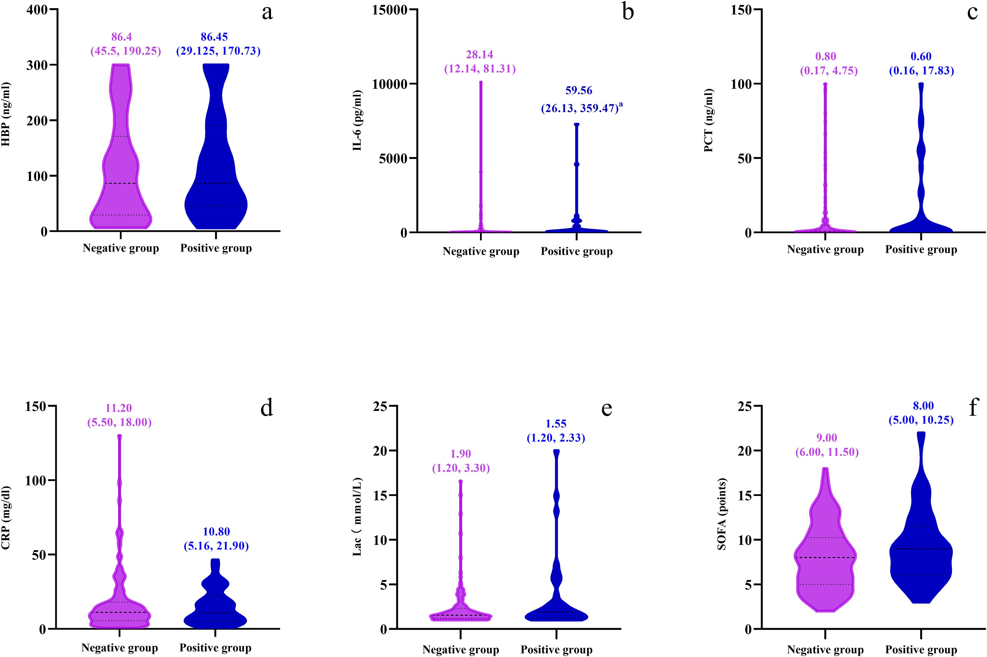 Figure 5. Violin plots depicting comparisons between negative and positive groups for six parameters: (a) HBP (ng/ml), (b) IL-6 (pg/ml), (c) PCT (ng/ml), (d) CRP (mg/dl), (e) Lactate (mmol/L), and (f) SOFA points. Each plot displays median values with interquartile ranges for both groups using distinct colors for clarity.