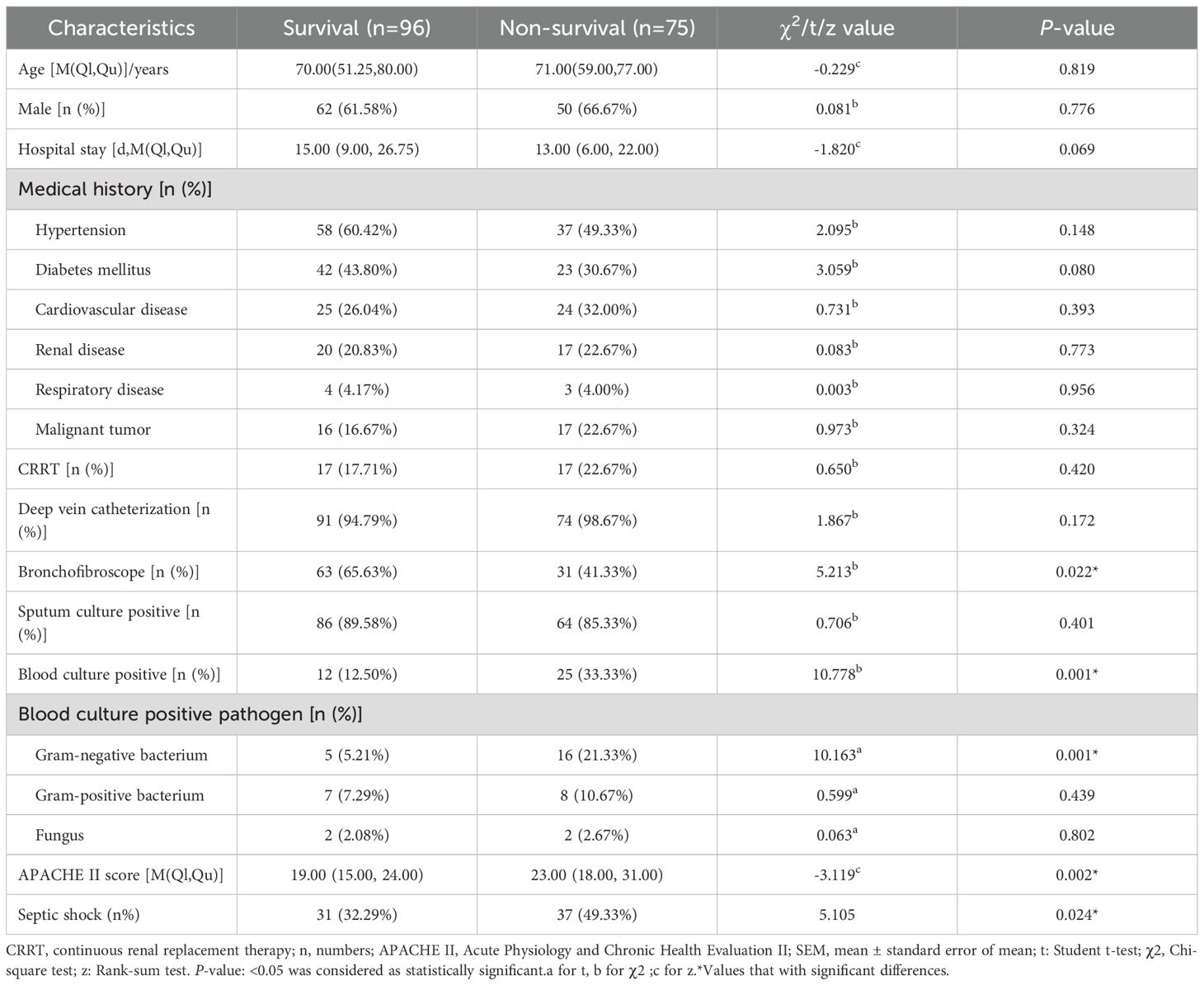 From September 2022 to September 2024, the research team collected clinical data of 181 patients with severe pneumonia complicated by sepsis. During the data screening process, 5 patients with hospital stay shorter than 72 hours and 5 patients who had received hormone, cytotoxic drugs or immunosuppressants were excluded. Finally, 171 cases were included in the statistical analysis (Figure 1). Among the 171 patients with severe pneumonia complicated by septic shock included in the analysis, 112 were male (accounting for 65.5%), and 59 were female (accounting for 34.5%); the age range was 22 to 93 years, with a median age of 70 years (interquartile range of 55 to 78 years), among which 121 patients (accounting for 70.1%) were 60 years old or above, and 50 patients (accounting for 29.9%) were under 60 years old. All patients were Han Chinese residents admitted to the ICU of Tianjin Medical University General Hospital (due to the population structure characteristics of the research center location, no patients of other ethnicities were included), and there were no foreign or ethnic minority patients. During the study period, 75 cases of all-cause death occurred, and all deaths occurred during hospitalization, with a mortality rate of 43.86% (75/171). According to the 28-day prognosis, the patients were divided into the survival group (n = 96) and the death group (n = 75). Further analysis showed that there were no significant differences between the two groups in terms of age, gender, underlying diseases (including hypertension, cardiovascular diseases, kidney diseases, etc.), continuous renal replacement therapy (CRRT), deep vein catheterization, positive rate of sputum culture, etc. (P > 0.05); however, in terms of the use of bronchoscopy, the proportion of patients in the survival group who received the examination was significantly higher than that in the death group; in terms of the positive rate of blood culture, the survival group was lower than the death group; in terms of the types of pathogenic bacteria in blood culture, the proportion of Gram-negative bacteria in the survival group was lower than that in the death group; in addition, the APACHE II score of the survival group was also significantly lower than that of the death group (Table 1).