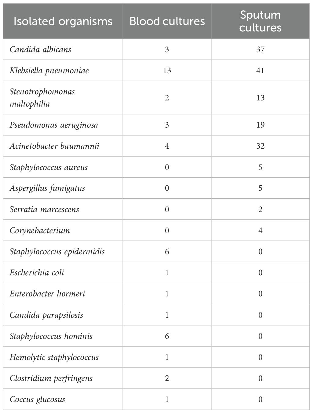 In this study, 39 patients presented with positive blood cultures (Table 2). Overall, gram-negative bacteria constituted the main cause of most infections. In the blood culture, a diverse range of microorganisms were detected, including Staphylococcus epidermidis 6 times, Staphylococcus hominis 6 times. Klebsiella pneumoniae occurred more frequently, reaching up to 13 times; furthermore, Acinetobacter baumannii appeared 4 times, and Candida albicans occurred 3 times. The presence of these microorganisms in the blood could indicate different infection statuses and potential risks. Sputum culture differed. Klebsiella pneumoniae occurred 41 times, Candida albicans 37 times, and Acinetobacter baumannii 32 times. Pseudomonas aeruginosa occurred 19 times, etc.