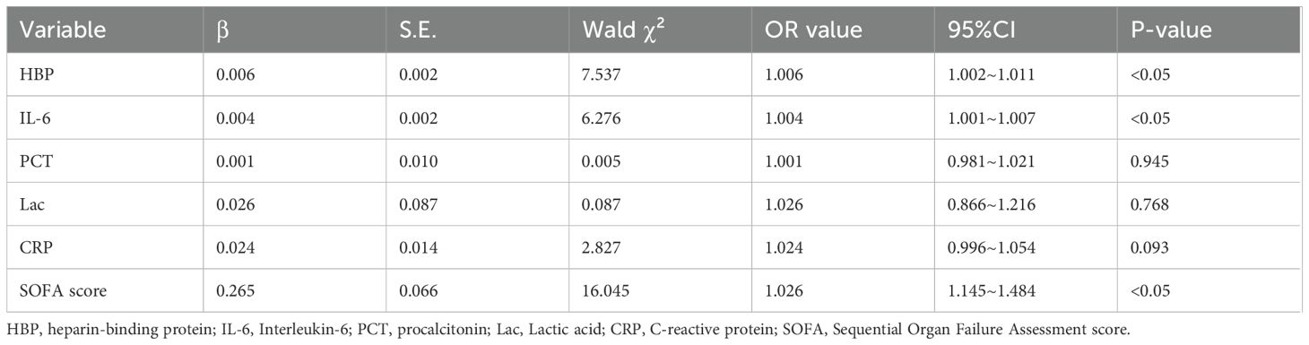 Severe pneumonia combined with sepsis is a prevalent and highly perilous disease in clinical practice, featuring high morbidity and mortality rates, and posing a serious threat to the life and health of patients (Bewick et al., 2008). Pulmonary inflammation gives rise to a considerable number of inflammatory factors and mediators, which enter the bloodstream and trigger a series of immune responses, leading to the continuous amplification of the inflammatory response. Subsequently, it causes systemic inflammatory response syndrome, increased vascular permeability, microcirculation disorders, coagulation dysfunction and other conditions, and ultimately results in sepsis (Angus and van der Poll, 2013; Li et al., 2020). The potential circulatory, cellular and metabolic disorders in patients with severe pneumonia accompanied by sepsis can give rise to multiple organ tissue hypoperfusion, resulting in hypoxia of the cells and tissues of the body, causing organ dysfunction and significantly elevating the risk of death. Studies have demonstrated that the case fatality rate of patients with septic shock is as high as 30% - 50% (Dellinger et al., 2004; Hotchkiss et al., 2016). Consequently, early diagnosis, prognostic risk assessment and timely as well as effective intervention are of paramount importance for improving the prognosis and quality of life of patients with sepsis resulting from severe pneumonia (Font et al., 2020). At present, the clinical diagnosis and evaluation of severe pneumonia complicated with sepsis primarily depend on traditional indicators, such as PCT, CRP, and SOFA scores. Nevertheless, these traditional indicators have certain limitations in practical application, such as relatively poor specificity and sensitivity. With the intensification of medical research, numerous new biomarkers have been discovered and applied in clinical practice. Serum HBP and IL-6, as potential biomarkers, have demonstrated some value in the diagnosis and prognosis assessment of various diseases. As one of the inflammatory mediators of polymorphonuclear neutrophil leukocytes (Tapper et al., 2002), HBP is pre-synthesized and promptly released in response to early infection, it is a chemical inducer for the activation of various cells, especially monocytes (Chang et al., 2018). During infection, HBP causes leakage of the endothelium of blood vessels and modulates the inflammatory responses of numerous cell types (Lu et al., 2021). Some studies on the association between HBP and sepsis suggest that HBP may serve as an early warning sign of sepsis, particularly in patients with organ failure (Kahn et al., 2019). IL-6 is an important cytokine that is often significantly elevated in patients with pneumonia. Studies have demonstrated (Han et al., 2020) that when a person is infected with pneumonia, the body’s immune system is activated, prompting the secretion and release of numerous cytokines. Among them, IL-6 levels change conspicuously as the disease progresses. High levels of IL-6 often indicate a more complicated disease, more difficulty in treatment, and a relatively poor prognosis. Therefore, monitoring the levels of HBP and IL-6 in patients with pneumonia is of considerable clinical significance for assessing the severity of pneumonia and formulating reasonable treatment plans.