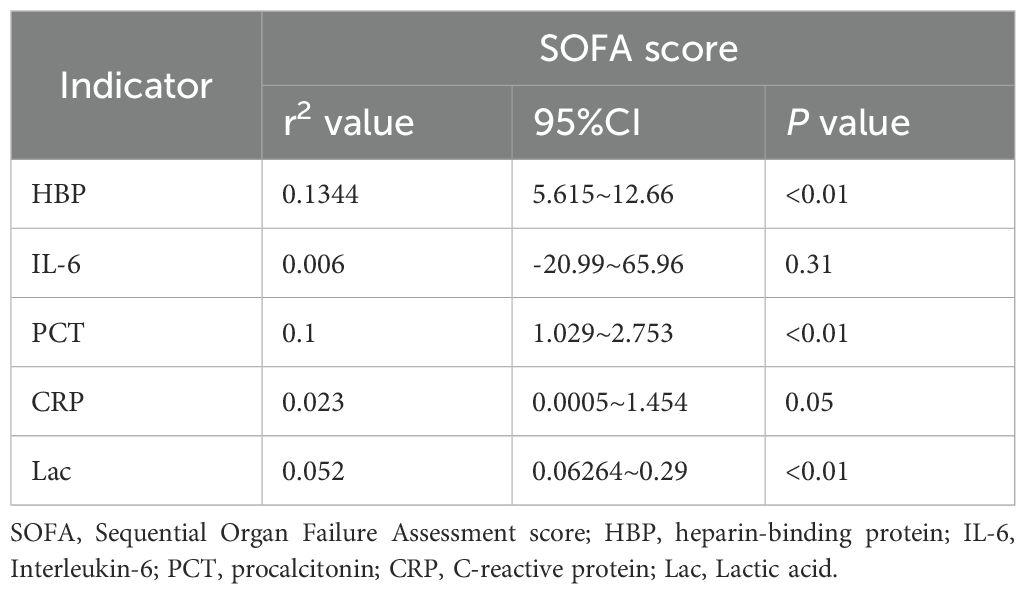 Through a retrospective analysis of 171 patients, this study first identified significant differences in prognostic indicators between groups: levels of HBP, IL-6, lactate (Lac), PCT, CRP, and SOFA scores in the non-survival group were significantly higher than those in the survival group (all P < 0.05), with a higher positive rate of blood culture and a higher proportion of gram-negative bacterial infections. These findings suggest that these indicators are directly associated with disease severity and poor outcomes. Further multivariate logistic regression analysis confirmed that HBP (OR = 1.006, 95% CI: 1.002-1.011), IL-6 (OR = 1.004, 95% CI: 1.001-1.007), and SOFA score (OR = 1.026, 95% CI: 1.145-1.484) were independent risk factors affecting the 28-day mortality risk of patients. For each unit increase in these three indicators, the mortality risk increased by 0.6%, 0.4%, and 2.6% respectively. This result directly established the core position of HBP and IL-6 in prognostic assessment. Correlation analysis further revealed the association between indicators and organ damage: HBP, PCT, and Lac were all positively correlated with SOFA scores (r² = 0.1344,0.100,0.052 respectively, all P < 0.01), among which HBP showed the strongest correlation, indicating its closest association with the degree of organ dysfunction. This finding is highly consistent with the pathological mechanism of HBP “directly damaging the vascular endothelial barrier” (Bentzer et al., 2016). To clarify the differences in predictive efficacy among various indicators, this study conducted pairwise comparisons of the area under the receiver operating characteristic curve (AUC) using the Delong test, and finally divided the indicators into three tiers: the optimal tier included IL-6 (AUC = 0.80, 95% CI: 0.71-0.87) and SOFA score (AUC = 0.78, 95% CI: 0.72-0.85), which were significantly superior to the third tier including PCT (AUC = 0.66, 95% CI: 0.57-0.74) and Lac (AUC = 0.70, 95% CI: 0.62-0.78); the intermediate tier included HBP (AUC = 0.73, 95% CI: 0.66-0.81) and CRP (AUC = 0.72, 95% CI: 0.64-0.79), which showed no statistical difference from the other tiers but demonstrated potential superior to traditional indicators in terms of numerical values. This tiered result verified the advantages of HBP and IL-6 from a statistical perspective, providing a clear basis for clinical indicator selection.
