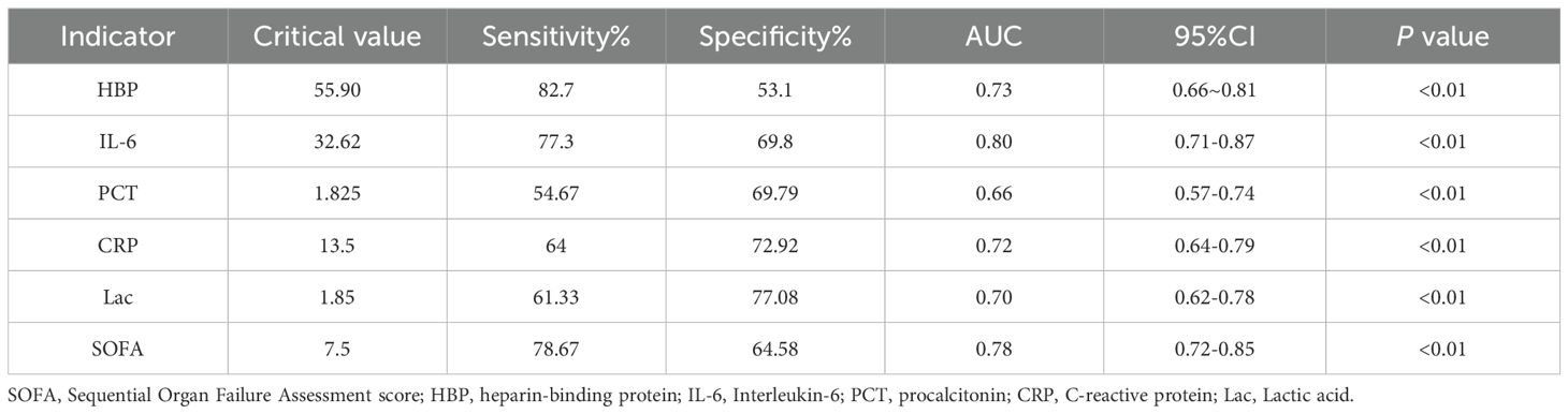 Result: Non-survivors had significantly higher HBP, IL-6, PCT, CRP, Lac, and SOFA scores than survivors (all P<0.05). IL-6 was markedly elevated in blood culture-positive patients (P<0.05), suggesting value in detecting bloodstream infections. Multivariate analysis confirmed HBP (OR = 1.006, 95% CI:1.002–1.011), IL-6 (OR = 1.004, 95% CI:1.001–1.007), and SOFA score (OR = 1.026, 95% CI:1.145–1.484) as independent prognostic factors (all P<0.05). ROC analysis showed IL-6 had the highest AUC (0.80), followed by SOFA (0.78) and HBP (0.73), with no significant AUC differences between IL-6 and SOFA (P = 0.719) or HBP and CRP/PCT (both P>0.05). Optimal cut-offs were 55.90 ng/mL for HBP (sensitivity 82.7%, specificity 53.1%) and 32.62 pg/mL for IL-6 (sensitivity 77.3%, specificity 69.8%). HBP correlated strongest with SOFA (r=0.60, P<0.01).