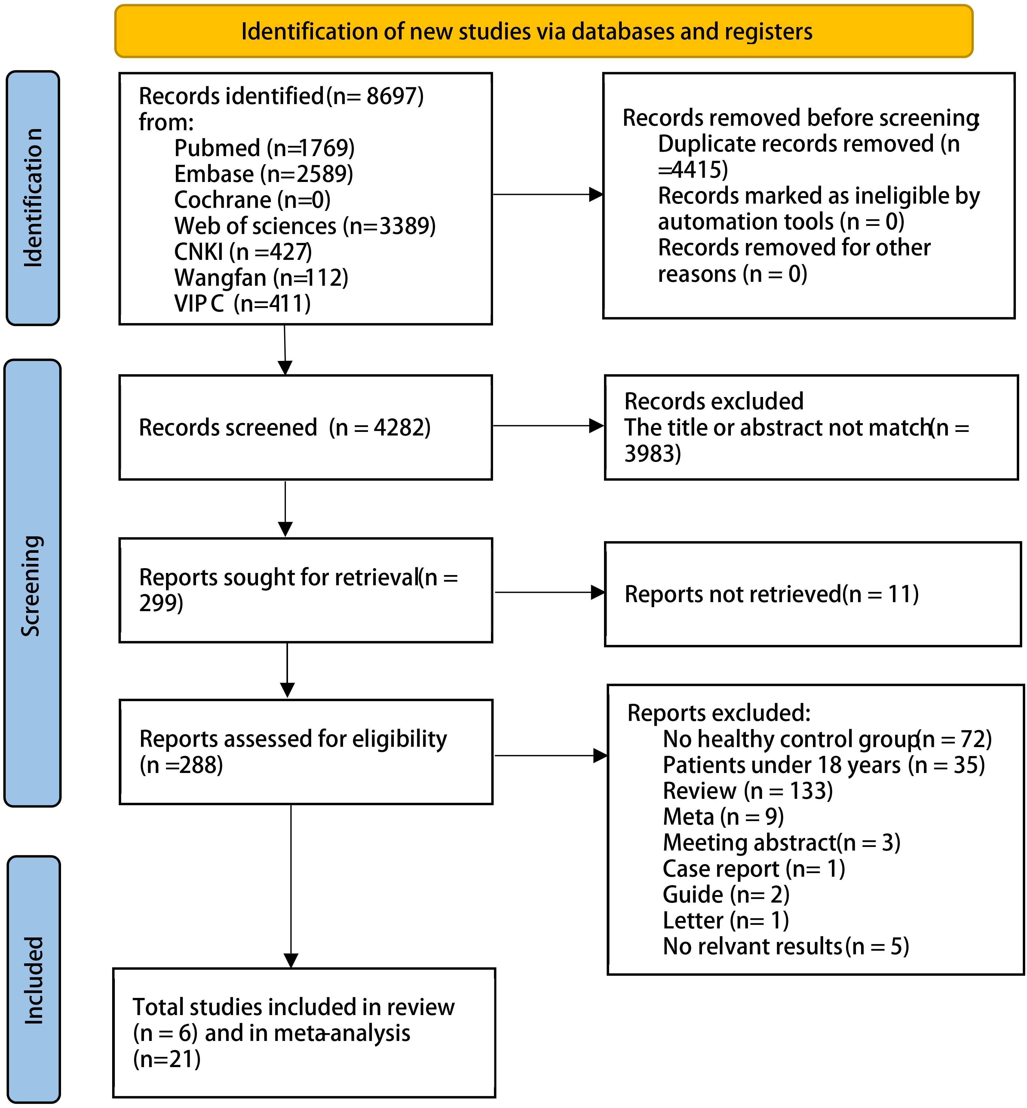 Flowchart depicting the identification and screening process for studies. Identification includes 8,697 records from seven databases, with 4,415 duplicates removed. Screening shows 4,282 records assessed, excluding 3,983. Retrieval attempts made for 299 reports, with 11 not retrieved. Eligibility assessment conducted on 288 reports, excluding reasons like lack of control group, age, and type. Final inclusion resulted in 6 studies for review and 21 for meta-analysis.