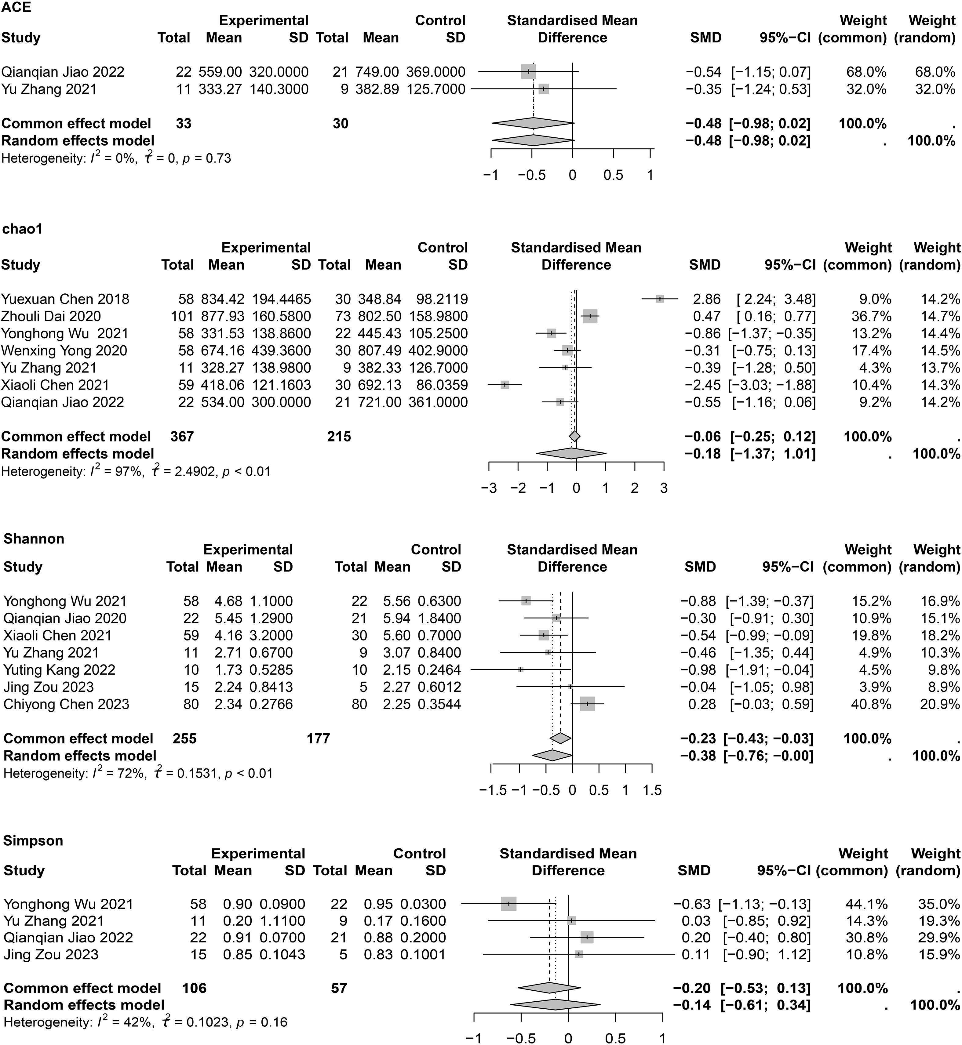 The α-diversity of intestinal flora included both community richness and evenness. Richness was mainly assessed using Chao1 and ACE indexes, while evenness was assessed using the Shannon and Simpson indexes. Meta-analyses of α-diversity are presented in Figure 2. Publication bias assessments are shown in Supplementary Table 6, with no significant publication bias detected.