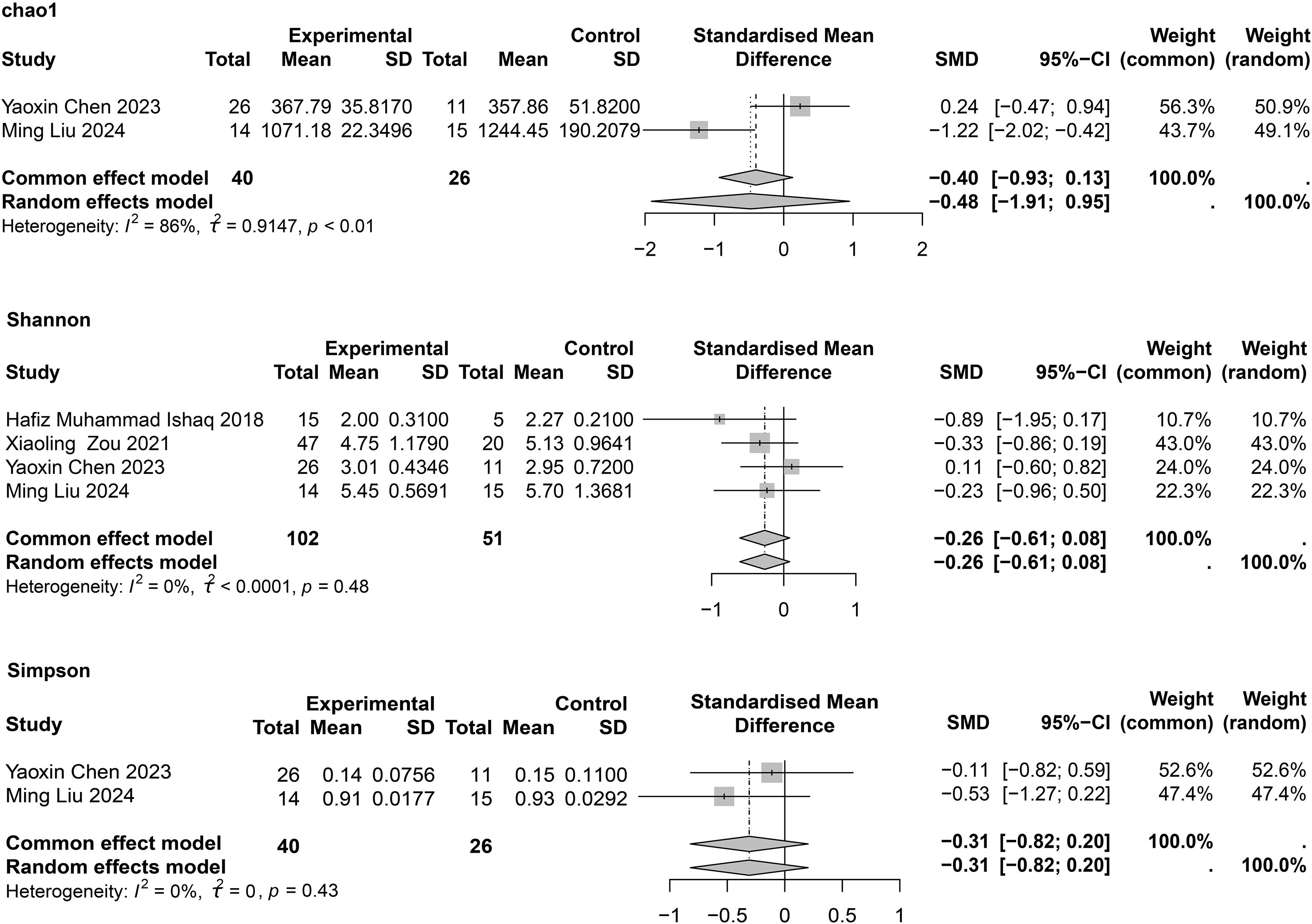 Forest plots summarizing the standardized mean differences for three diversity indices: Chao1, Shannon, and Simpson. Each index compares experimental and control groups with effect sizes represented by boxes and confidence intervals. The heterogeneity for Chao1 is high with I² at 86%, Shannon at 0%, and Simpson at 0%. Each forest plot includes both common and random effects models.