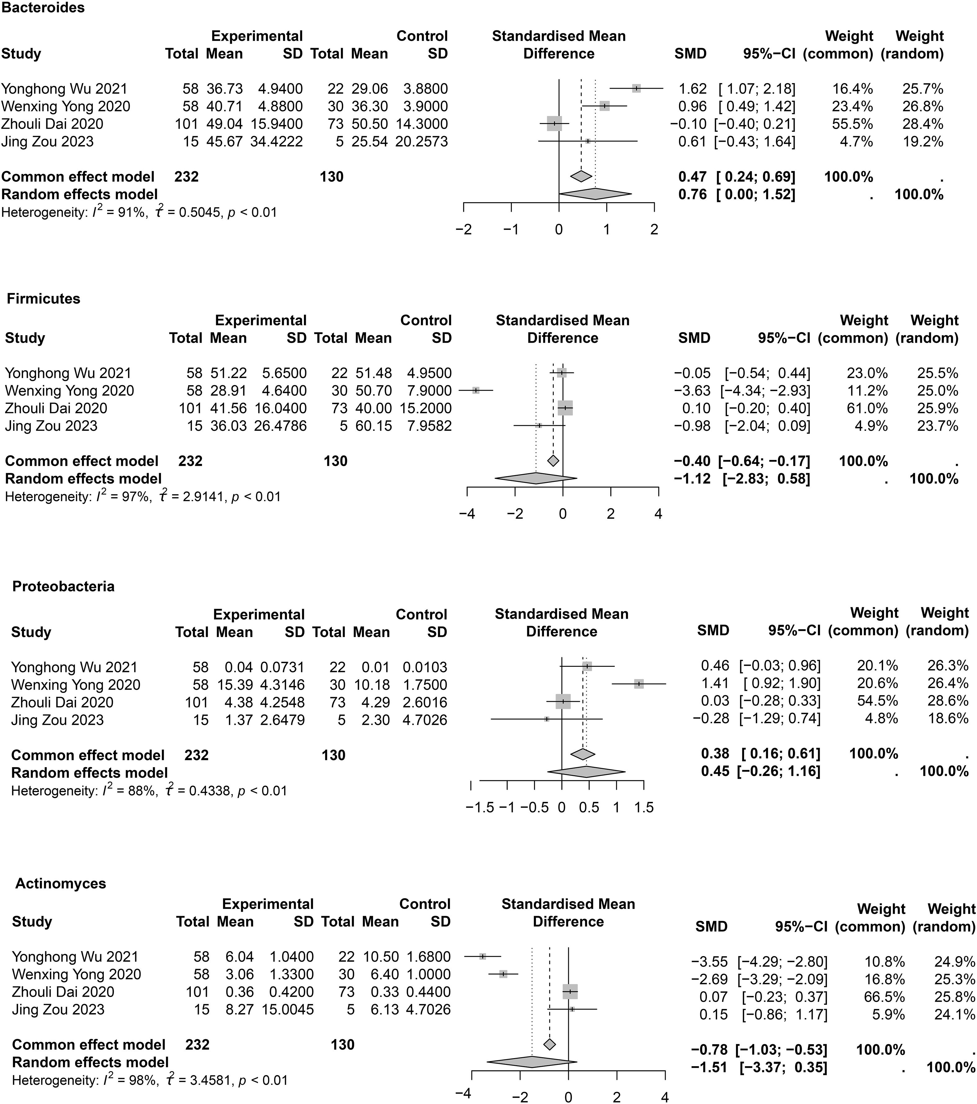Forest plot showing meta-analyses of four bacterial groups: Bacteroides, Firmicutes, Proteobacteria, and Actinomyces. Each section lists several studies comparing experimental and control groups, presenting metrics including mean, standard deviation, and standardized mean difference (SMD). Diamond shapes represent overall SMD with 95% confidence intervals. Heterogeneity statistics are provided under each model, indicating variability across studies.