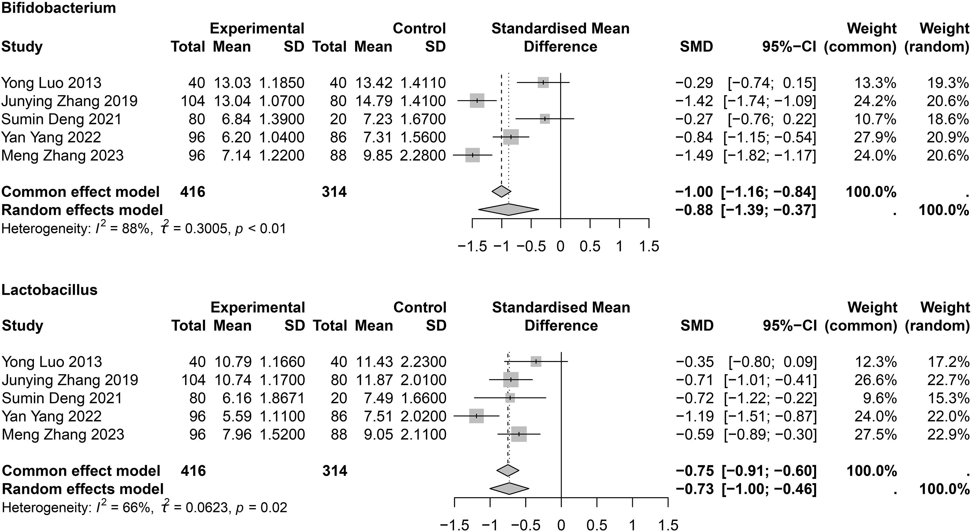 Forest plot showing standardized mean differences comparing experimental and control groups for Bifidobacterium and Lactobacillus across multiple studies. Each study's effect size, confidence intervals, total participants, means, standard deviations, and weights are detailed. Heterogeneity statistics for each model are included, with Bifidobacterium showing higher heterogeneity (I2 = 88%) compared to Lactobacillus (I2 = 66%).