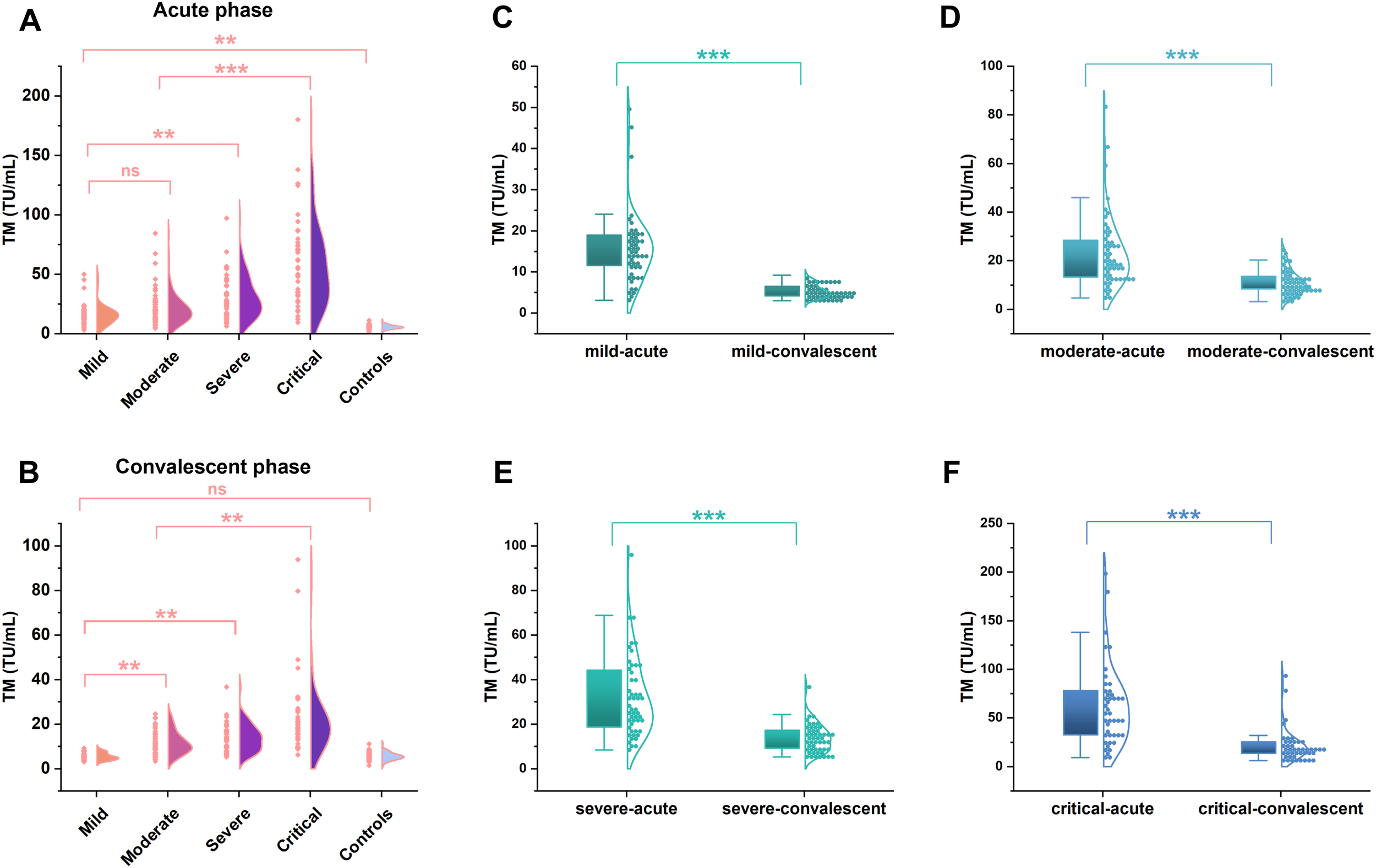 The TM levels in patients with hemorrhagic fever with renal syndrome of varying severity. The concentrations of TM in different severity of HFRS patients (n=196) were determined by the chemiluminescence immunoassay. A significant increase was found from the mild to critical type patients (**p <0.01, A) at the acute phase, even though a significant difference was not observed between the mild and moderate type patients (ns; p >0.05, A). While a remarkable decline in TM levels emerged from the acute phase to the convalescent phase in each patient group (***p <0.001, C–F), but the TM levels in the convalescent phase were still higher than that of the controls (**p <0.01, B), except a similar levels between the mild type patients and the controls (ns; p >0.05, B).