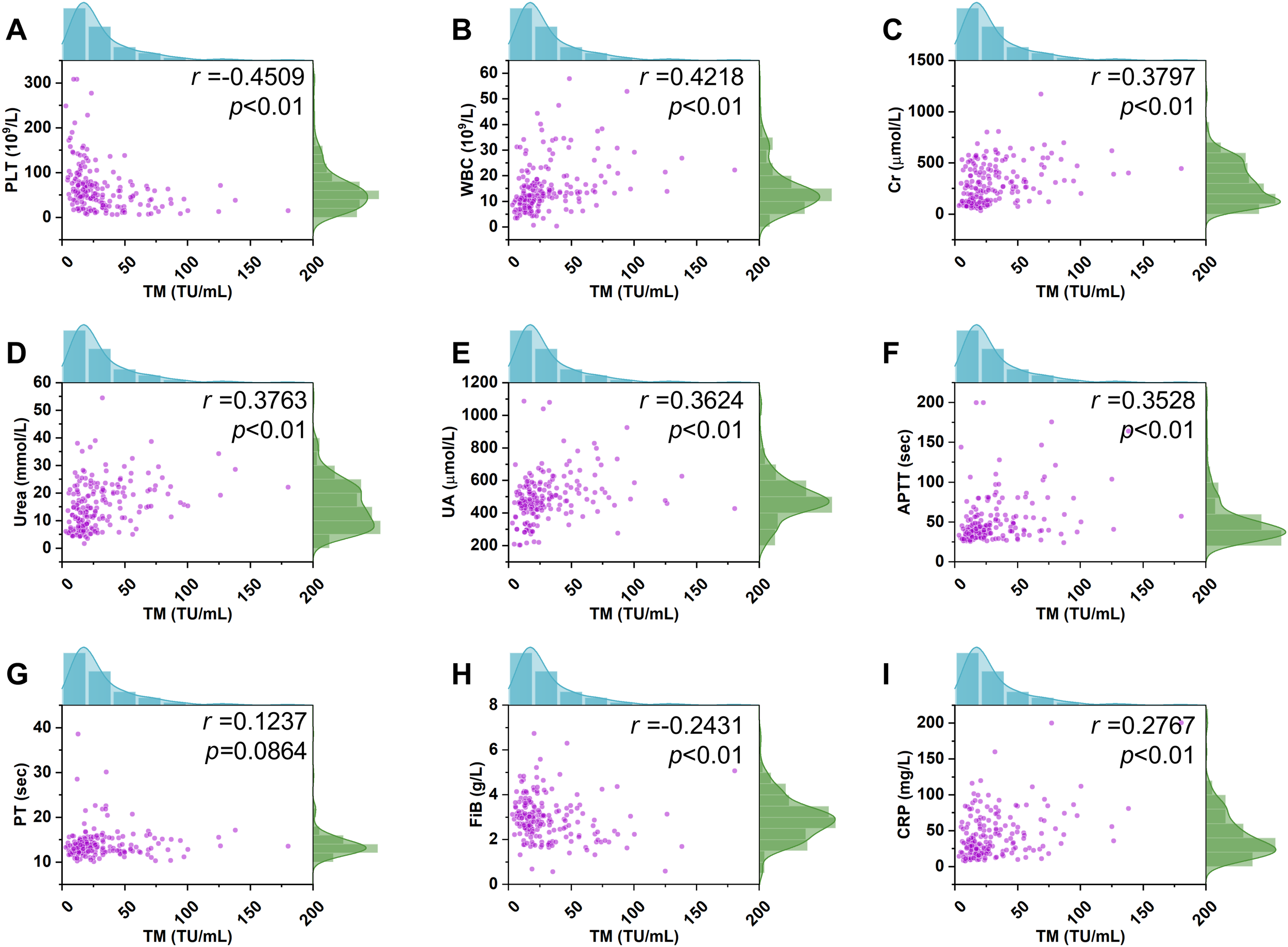 Correlation of the TM with the conventional parameters. A positive correlation between TM and the WBC levels in HFRS patients (n=196) was observed (p <0.01, r= 0.4218, B). A similar positive relationship between TM levels and other conventional indices including Cr, urea, UA, APTT, and CRP was also noted (p <0.01, r= 0.3797, p <0.01, r= 0.3763, p <0.01, r= 0.3624, p <0.01, r= 0.3528, p <0.01, r= 0.2767, C–F, I). In contrast, a negative correlation of TM levels with PLT and Fib was found (p <0.01, r= -0.4509, p <0.01, r= 0.2431, A, H). However, a significant correlation of TM levels with PT was not observed (p =0.0864, r= 0.1237, G).