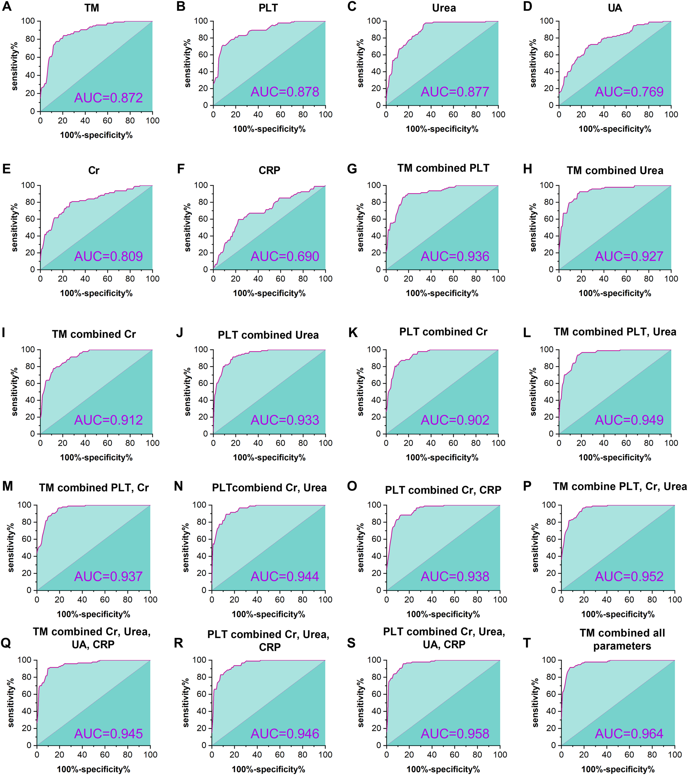 ROC curves for the predictive efficacy of HFRS severity. The figure shows the predictive efficacy of TM, PLT, urea, UA, Cr, and CRP and the combination of varying indices for the severity in HFRS patients. TM showed a significant predictive capacity, with an AUC of 0.872 (p <0.001, (A) higher than that of the conventional parameters (D-F), except for the PLT and urea (B, C). In addition, predictive capacity is elevated with the number of combination parameters (G-S), and the most powerful prediction can be found in the combination of TM with all conventional parameters presented herein (T).