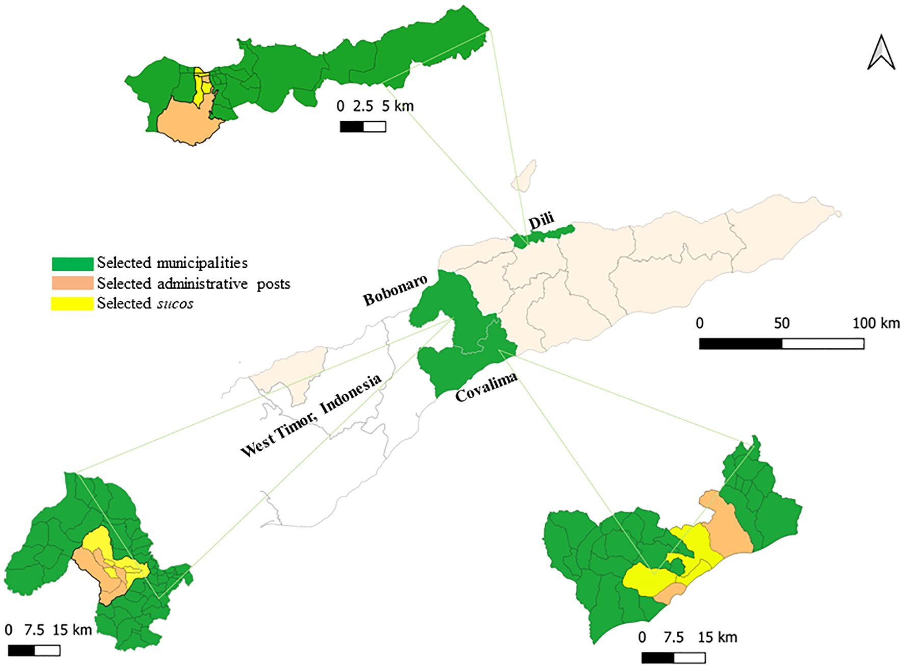 This cross-sectional study was conducted from mid-February to mid-March 2023 in Timor Leste, a small country that constitutes the eastern half of Timor Island. It is administratively divided into municipalities, administrative posts, and sucos, which are the smallest administrative unit. The country has a population of 1.3 million people distributed across 14 municipalities and 250,270 private households (Timor Leste National Institute of Statistics, 2023). This study was conducted in three municipalities: Dili, Bobonaro, and Covalima (Figure 1). Dili is the capital city, has a total land area of 364 km2, and is the most populous municipality, with 324,738 inhabitants (Timor Leste National Institute of Statistics, 2023). Bobonaro is located in the northwest of Timor-Leste, and has a land area of 1,378 km2 (Bobonaro Municipality Authority, 2023) and a population of 106,639 people in 20,820 households distributed across 6 administrative posts and 50 sucos (Timor Leste National Institute of Statistics, 2023). Covalima lies in the southwest of Timor-Leste, and has a land area of 1,207 km2 (Covalima Municipality Authority, 2023) and a population of 73,933 people in 15,678 households distributed across 7 administrative posts and 30 sucos (Timor Leste National Institute of Statistics, 2023). Covalima and Bobonaro share land borders with the East Nusa Tenggara province of Indonesia.