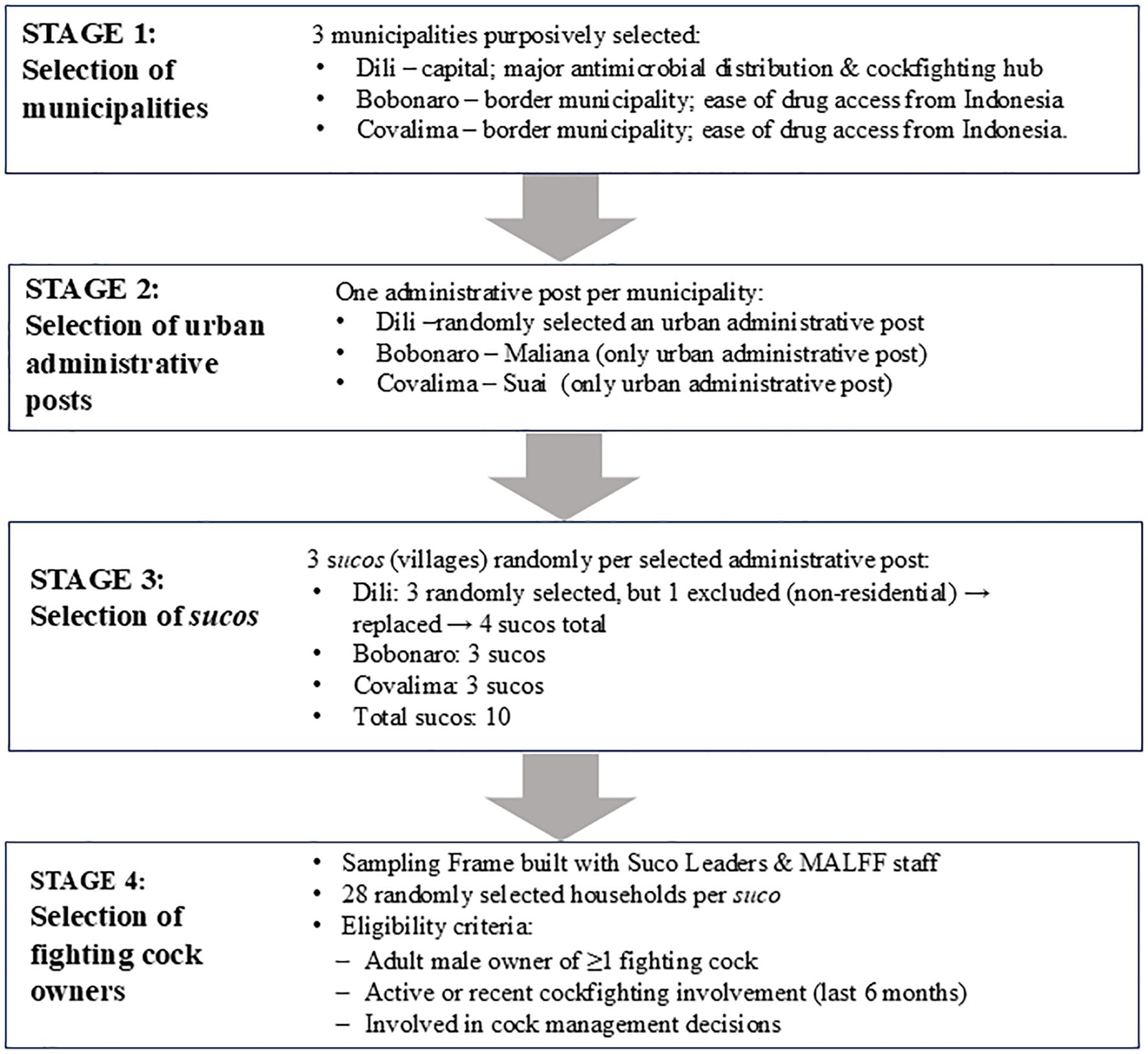 The three municipalities of Dili, Bobonaro, and Covalima were purposively selected. Dili, was selected as it is a central point for antimicrobial distribution chains and also a key cockfighting hub, where cockfighting occurs daily (Hutt, 2015). The two border municipalities of Bobonaro and Covalima were selected because of the ease of access to antimicrobials from Indonesia. Oecusse, the third border municipality, was excluded because of its remote location. In each municipality, one urban administrative post was selected, as in urban locations it is easier to access antimicrobials and cockfights occur every week. The single urban administrative posts in Bobonaro and in Covalima were selected and one urban administrative post was randomly selected in Dili. Three sucos in each of these administrative posts were then randomly selected. The number of sucos selected was limited to three in each administrative post for logistical reasons. In Dili, three sucos were randomly selected at the study design stage, but it was found during data collection that one of the three sucos had a limited number of fighting cock owners as it was predominantly a non-residential area. Therefore, another suco was randomly selected, resulting in selection of a total of four sucos in Dili.