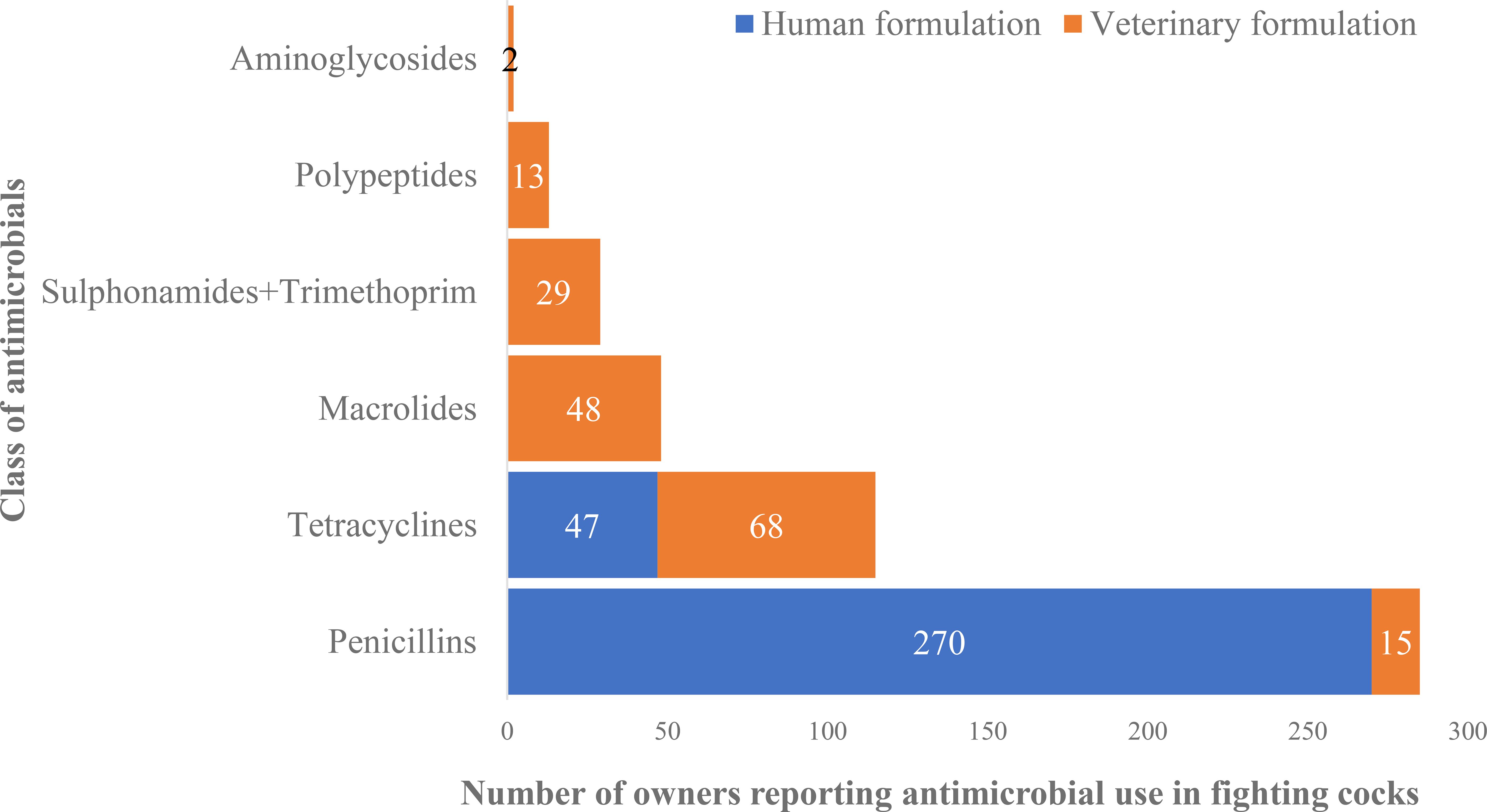 The classifications of the antimicrobials given by participants to their fighting cocks, by class and formulation (veterinary versus human) are shown in Figure 3. Six antimicrobial classes were commonly given to fighting cocks, with the most frequently reported being penicillins, tetracyclines, and macrolides. Human formulations constituted the majority (94.7%) of the penicillins given to fighting cocks, while both human(40.9%) and veterinary (59.1%) formulations of tetracyclines were administered to birds, with only veterinary formulations of the less commonly administered classes given to fighting cocks.