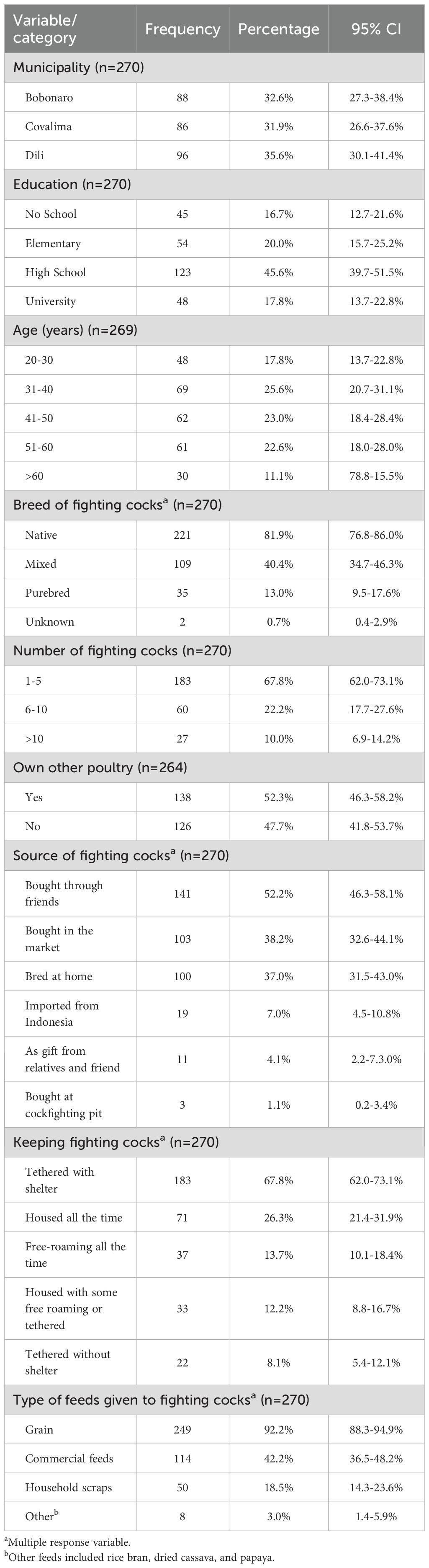 A total of 275 male individuals who owned fighting cocks were interviewed across nine sucos in the municipalities of Dili, Bobonaro, and Covalima. Of these, 270 participants were included in the analyses, with five participants excluded because of extensive gaps in the data collected from them. The demographic characteristics of fighting cock owners and elements of fighting cock management are presented in Table 1. The participants had a median age of 44 (range 20-83) years. Around one-sixth (45/270) had not attended school, while the majority had completed formal education, with most having completed high school (45.6%, 123/270) or university education (17.8%, 48/270). The majority (81.9%, 221/270) owned native breed cocks, with a median number of four birds per owner (range 1-91). Apart from fighting cocks, around half (52.3%, 138/264) of them owned other poultry. Overall, 86.0% (160/186) of participants (93.2% in Bobonaro, 77.6% in Covalima, 92.3% in Dili) took birds to cockfighting rings.