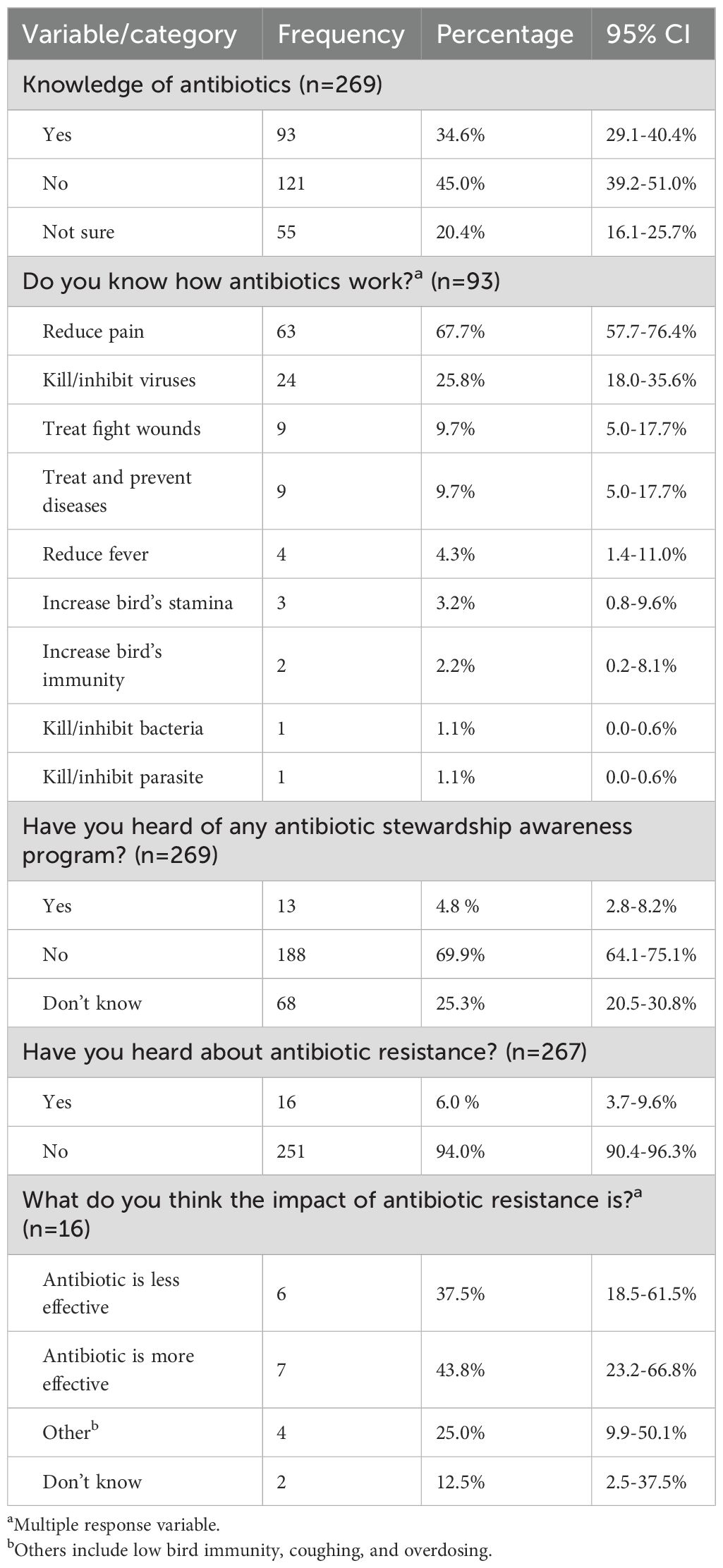Knowledge about antimicrobials and AMR is summarized in Table 2. Only 34.6% (93/269) of participants reported that they knew what antimicrobials were. The majority said they did not know (45%, 121/269) or were unsure (20.4%, 55/269). The respondents living in urban municipalities had about 2.4-times (95% CI [1.4-4.1], p-value = 0.002) higher odds of being aware compared with those in rural areas. Higher education was also associated with greater awareness (aOR = 2.3, 95% CI [1.3-4.2], p-value = 0.007), while age had no meaningful effect (aOR = 0.9, 95% CI [0.5-1.5], p-value = 0.186) (Table 3). Of those who reported knowledge about antimicrobials, only one participant stated that antimicrobials are used for killing or inhibiting bacteria, while the majority said that antimicrobials were used to reduce pain (68.8%, 64/93). Around a quarter (25.8%, 24/93) of the participants said that antimicrobials were used for killing or inhibiting viruses. A small proportion said that antimicrobials were used for treating fight wounds (9.7%, 9/93), treating and preventing diseases (9.7%, 9/93), reducing fever (4.3%, 4/93), increasing bird stamina (3.2%, 3/93), increasing the bird’s immunity (2.2%, 2/93), and killing or inhibiting parasites (1.1%, 1/93). When asked if they had heard of any antimicrobial stewardship awareness program, less than 5% (13/269) said they had heard of one. Those that had heard of an antimicrobial stewardship awareness program came across it through social media (4/13), human and animal health workers (4/13), and television (3/13).