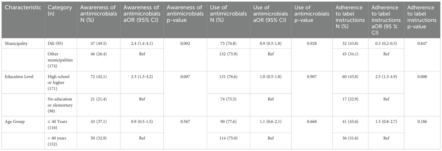 There was no evidence of an association between the use of antimicrobials and municipality (aOR = 0.9, 95% CI [0.5-1.8], p-value = 0.928), education (aOR = 1.0, 95% CI [0.5-1.8], p-value = 0.907) or age (aOR = 1.1, 95% CI [0.6-2.1], p-value = 0.668). However, education was associated with adherence to label instructions when using antimicrobials (aOR = 2.5, 95% CI [1.3-4.9], p-value = 0.008) (Table 3).