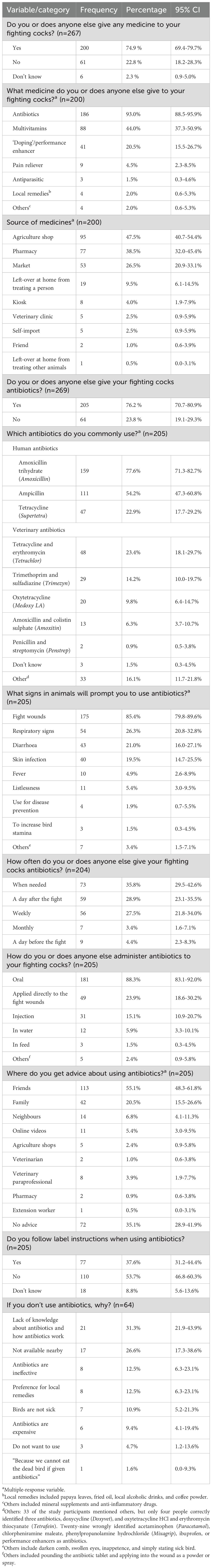 When asked specifically about antibiotics, 76.2% (205/269) said antibiotics had been given to their fighting cocks. Human antimicrobials were given by 89.8% (184/205) of these participants their fighting cocks, with the most common drugs given being amoxicillin trihydrate (77.5%, 159/205), ampicillin (54.2%, 111/205) and tetracycline (22.9%, 47/205). Veterinary antimicrobials were given to fighting cocks by 37.1% (76/205) of these participants, with the most common being tetracycline and erythromycin (Tetrachlor) (23.4%, 48/205), trimethoprim and sulfadiazine (Trimezyin) (14.2%), oxytetracycline (Medoxy LA) (9.8%), amoxicillin and colistin sulphate (Amoxitin) (6.3%), and penicillin and streptomycin (Penstrep) (0.9%).