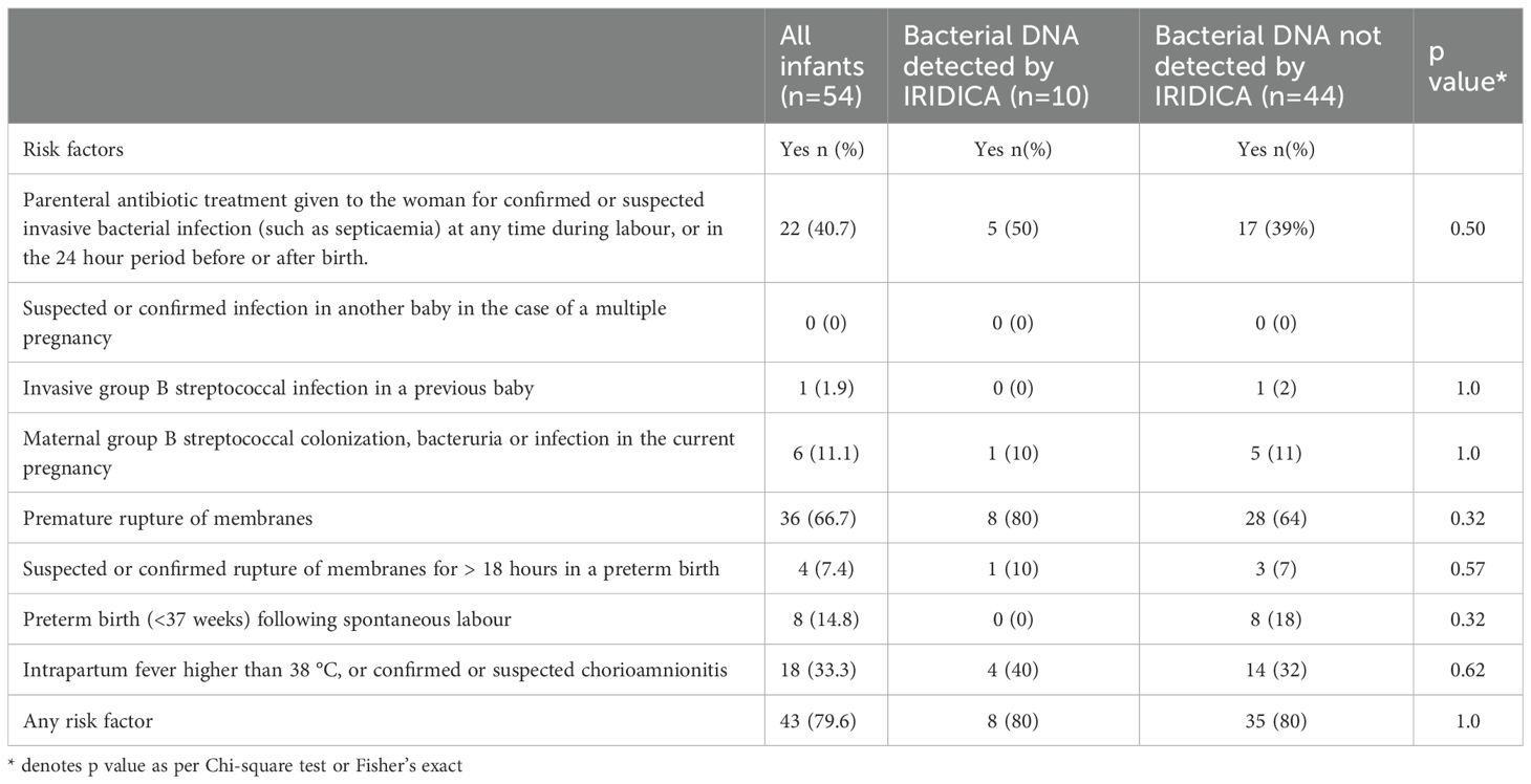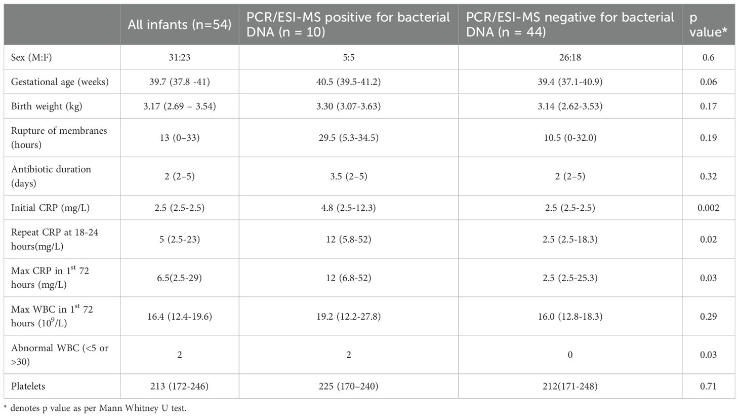 Results: 54 infants were studied with a median (IQR) gestational age and birth weight of 39.7 (37.5-41.0) weeks and 3.2 (2.7-3.5) kg respectively. 1 infant had both bacterial DNA detected on PCR/ESI-MS and bacterial growth on blood culture (Group B Streptococcus). 9 infants had bacterial DNA detected but with negative blood culture. The bacteria identified were Streptococcus sp (n=3) Sneathia (n=1), Cutibacterium acnes(n=6),. All infants with no bacterial DNA detected on PCR/ESI-MS also had a negative blood culture result. Infants with positive bacterial DNA identification in blood had significantly higher CRP values; initially (p=0.002), when repeated after 18-24 hours (p=0.02) and maximally within the first 72 hours (p=0.03). The proportion of infants with a CRP> 5 mg/L was significantly higher if bacterial DNA had been detected (p=0.01).