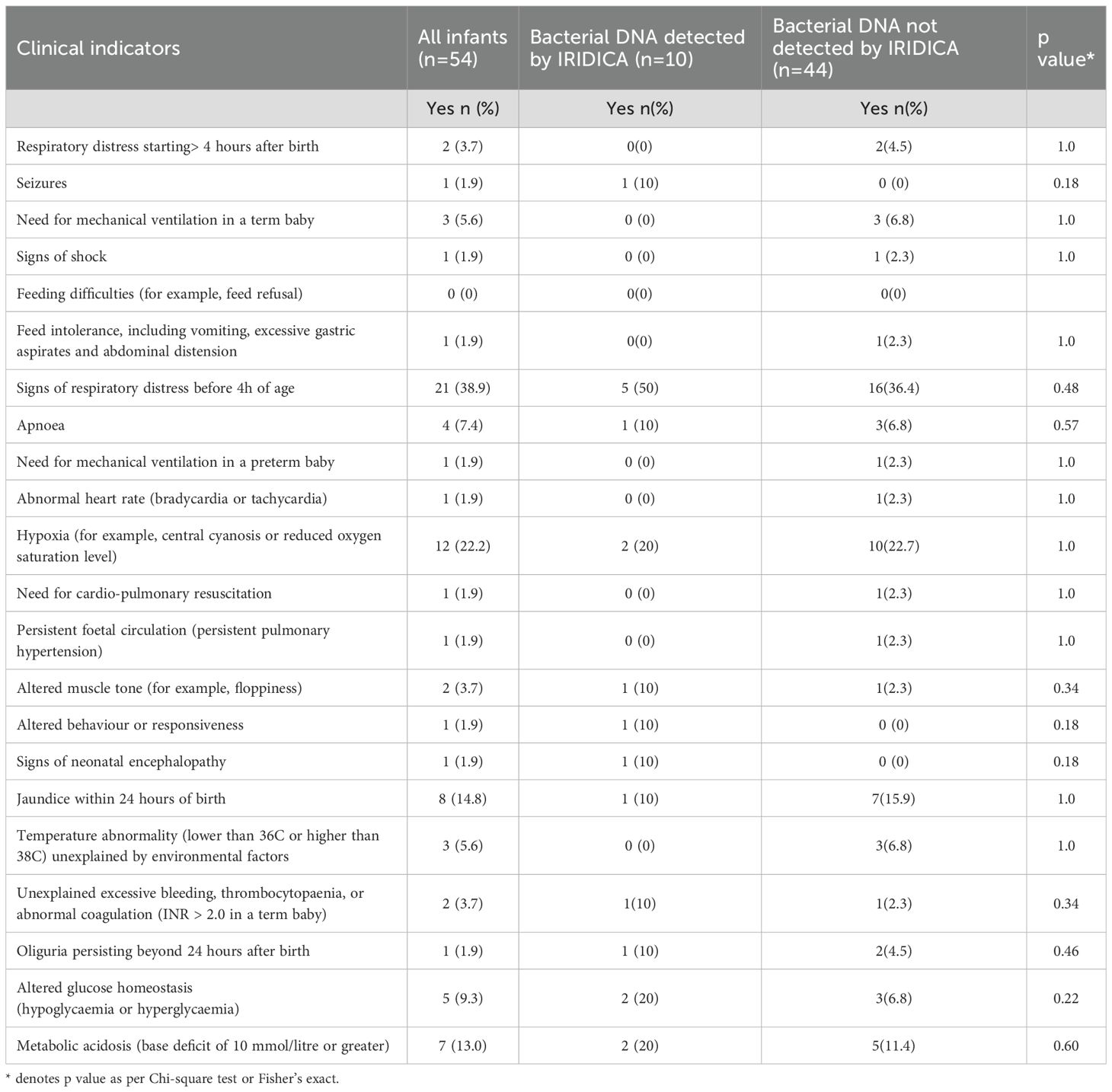 Forty-three (80%) infants had one or more perinatal risk factors for early-onset infection (Table 2A). The most common risk factors were: premature rupture of membranes (n=36, 67%), parenteral antibiotics given to mother (22, 41%) and intrapartum fever or chorioamnionitis (n = 18, 33%). The common symptoms suggestive of infection in this cohort were: respiratory distress before 4 hours of age (n=21, 38.9%), hypoxia (n=12, 22.2%), jaundice within 24 hours of birth (n=8, 14.8%) and metabolic acidosis with base deficit of greater than 10 mmol/l (n=7, 13%). There were 36 (67%) infants with one or more symptoms of infection (Table 2B). All these infants survived to discharge.