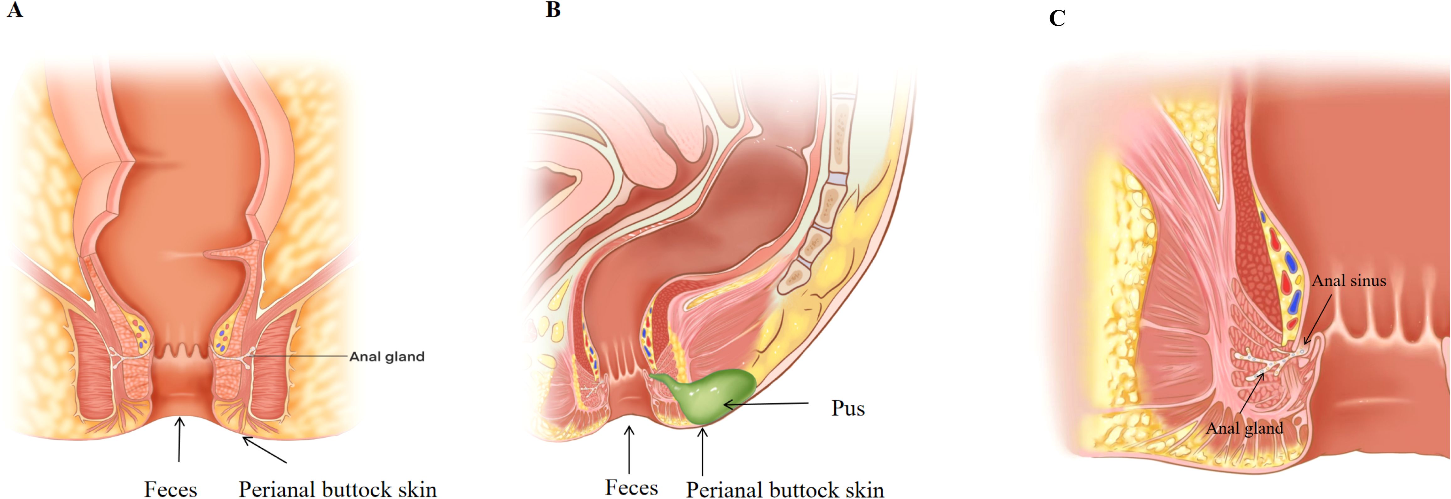 An anorectal abscess is a common surgical condition that presents as a collection of pus in the soft tissues and interstitial spaces around the anorectum, leading to symptoms including redness, swelling, and pain, and in severe cases, progressing to life-threatening necrotizing fasciitis (Lohsiriwat, 2016). The vast majority of anorectal abscesses are thought to be caused by cryptoglandular infections, which can spread in multiple directions and lead to different types of abscesses (Pearce et al., 2016), but their pathogenesis remains unclear. The cryptoglandular infection doctrine is currently the most widely accepted theory of the etiology of anorectal abscesses, first proposed by Eisenhammer in 1956 and further supported by anatomical evidence from Parks in 1961 (Parks, 1961). It has been speculated that the cause of anal gland infection is obstruction of the anal gland outlet duct by fecal material or trauma, causing the secretions in the gland ducts to not drain properly into the anal canal, leading to infection and pus. However, there is insufficient evidence to support this hypothesis (Gosselink et al., 2015). Once the disease is clearly diagnosed, surgical treatment is preferred. However, recurrence, anal fistula formation, slow wound healing, and other poor outcomes are common, imposing a heavy burden on both surgeons and patients (Sahnan et al., 2017). It is also worth noting that many anorectal abscesses heal completely without recurrence after simple incision and drainage (Hamadani et al., 2009). Previous studies on anorectal abscesses have focused on precise preoperative anatomical assessment and improvement of surgical approaches, while neglecting etiological studies, which may explain the lack of success in improving postoperative prognosis despite the proliferation of new surgical techniques. Therefore, there is an urgent need to develop new strategies to prevent and treat this disease.