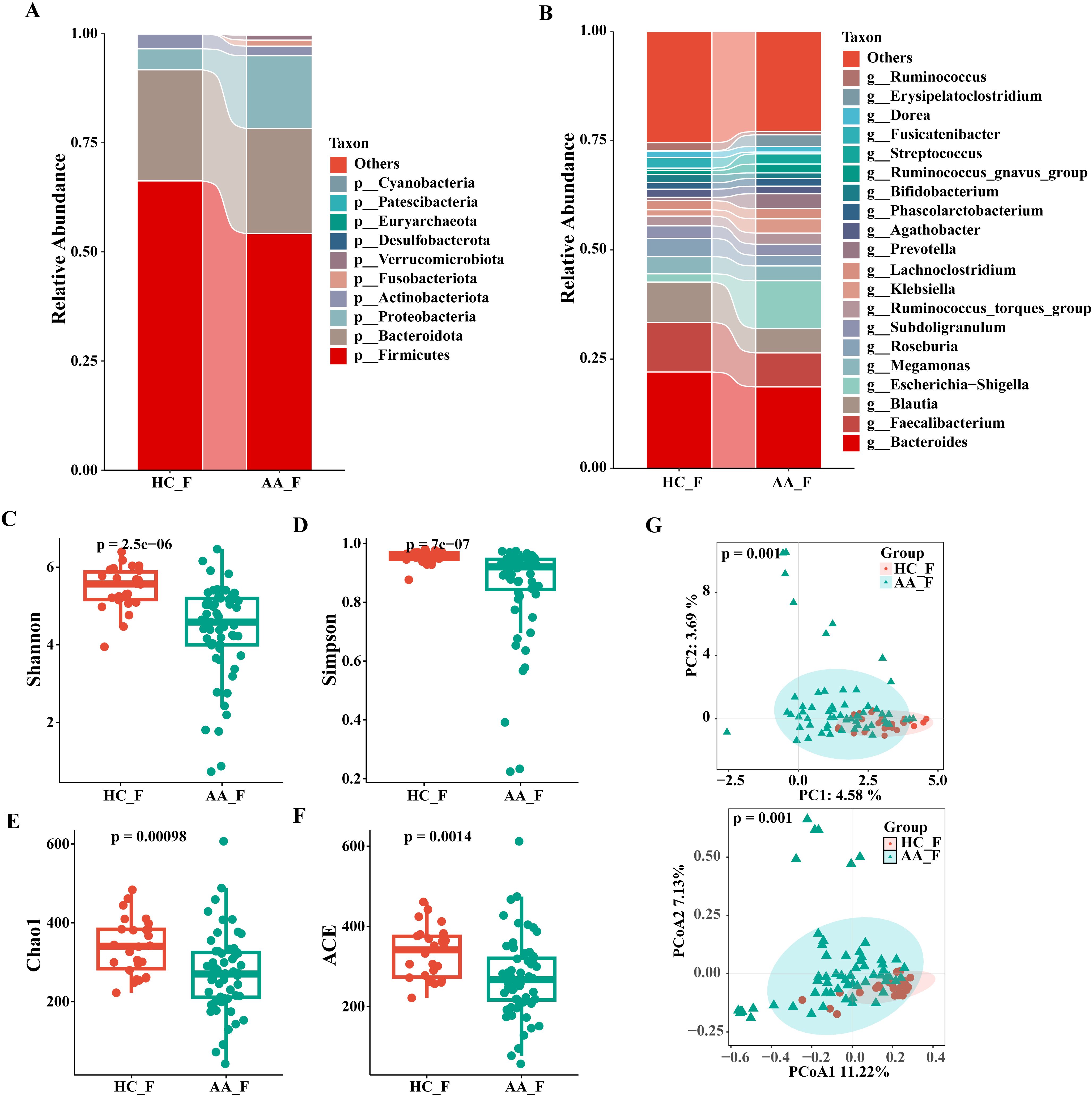 Figure 2. Composition and relative abundance of the gut microbiota at the phylum (top 10) and genus (top 20) level and analysis of α- and β-diversity in the HC and AA groups. (A) Phylum level. (B) Genus level. (C) Shannon index. (D) Simpson index. (E) Chao1 index. (F) ACE index. (G) Principal component analysis (PCA) and Principal coordinates analysis (PCoA). HC_F, gut microbiota in healthy control group. AA_F, gut microbiota in anorectal abscess group. (C-F) Wilcoxon rank-sum test showed that the differences in α-diversity among the two groups were significant (P< 0.001, Wilcoxon rank sum test), which meant that the species richness and evenness of gut microbiota in the HC group was higher than in the AA group. (G) Principal component analysis (PCA) and principal coordinate analysis (PCoA) by Bray-Curtis dissimilarity matrices (PERMANOVA, P = 0.001).