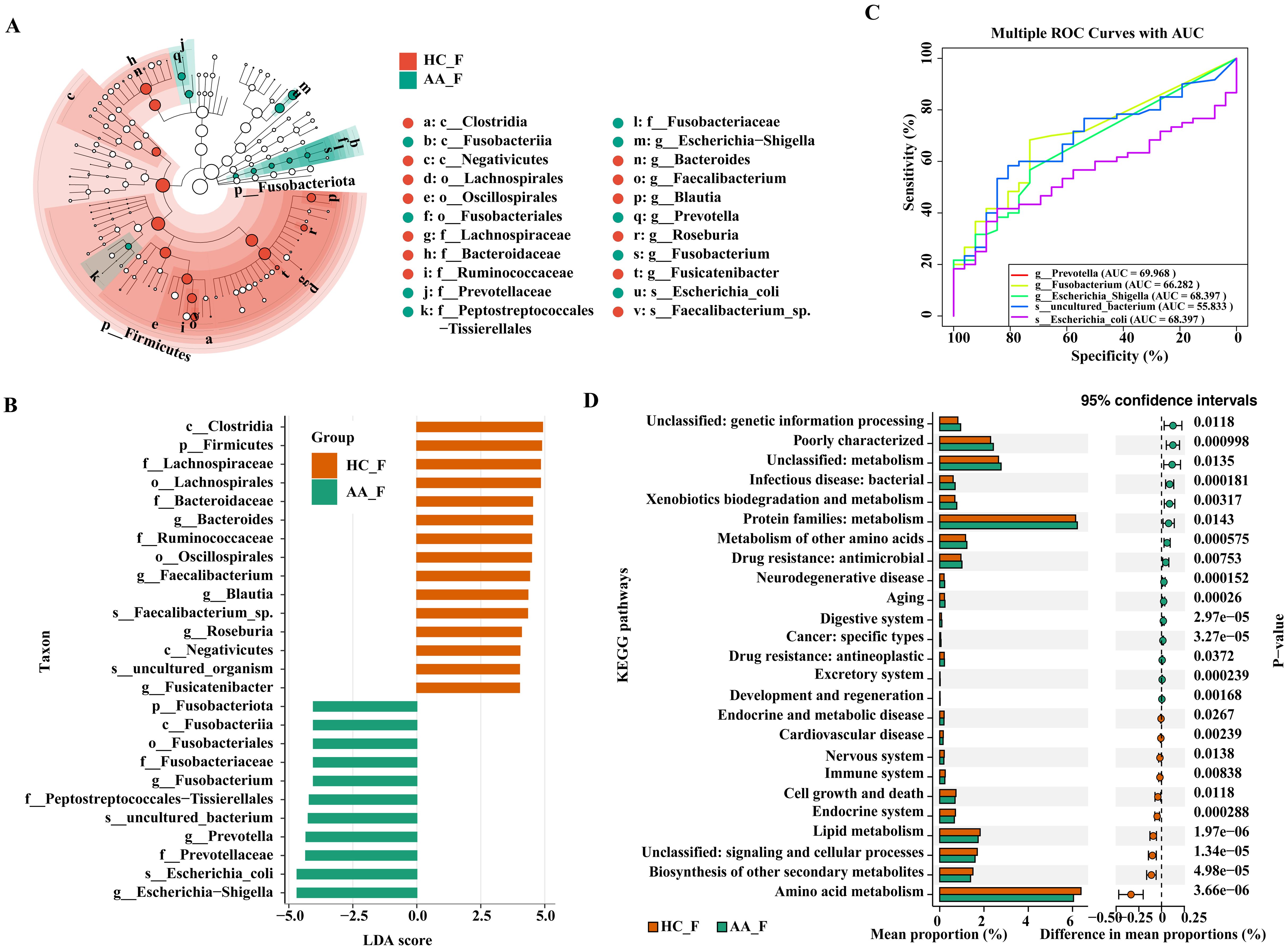 Figure 3. LEfSe, ROC, and KEGG analysis of the differential gut microbiota in the HC and AA groups. (A) Cladogram displaying the phylogenetic distribution of the microbiota, each circle represents a distinct phylogenetic hierarchy, progressing radially from phylum to genus from inner to outer rings. The diameter of each circle is proportional to the abundance of the corresponding taxon. (B) Histogram. The length of the columns indicates the value of the effect of the differential species. (C) ROC analysis. (D) KEGG pathway enrichment analysis (P< 0.05, Wilcoxon rank sum test). AUC, area under the curve. KEGG, Kyoto Encyclopedia of Genes and Genomes. LDA, linear discriminant analysis. LEfSe, linear discriminant analysis effect size. ROC, receiver operating characteristic curve. HC_F, gut microbiota in healthy control group. AA_F, gut microbiota in anorectal abscess group.