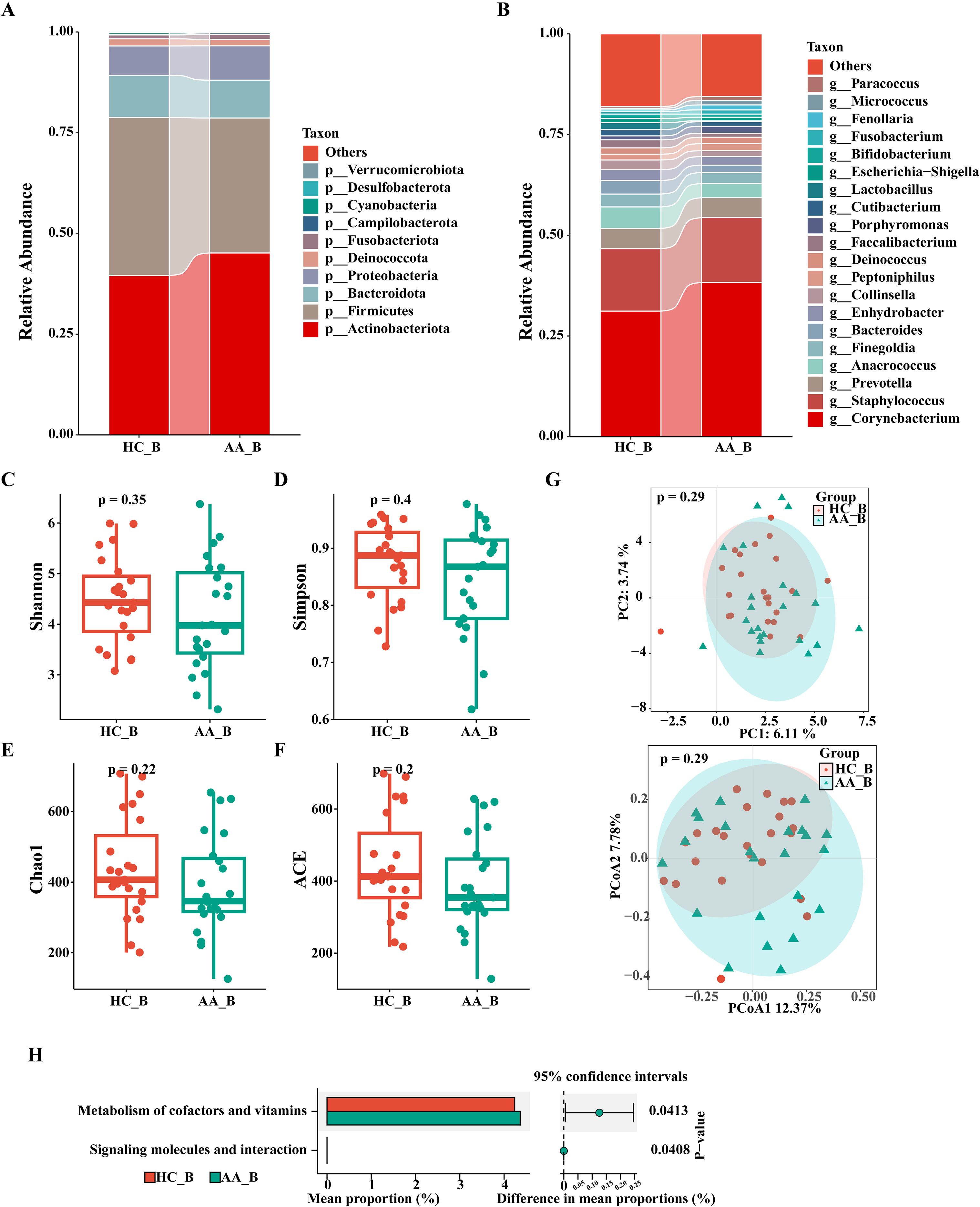 Figure 4. Analysis of the composition and gene function prediction of the perianal buttock skin microbiota in the HC_B and AA_B groups. (A) Phylum level. (B) Genus level. (C) Shannon index. (D) Simpson index. (E) Chao1 index. (F) ACE index. (P>0.05, Wilcoxon rank sum test). (G) Principal component analysis (PCA) and Principal coordinates analysis (PCoA) (P = 0.29, PERMANOVA). (H) KEGG analysis (P<0.05, Wilcoxon rank sum test). KEGG, Kyoto Encyclopedia of Genes and Genomes. HC_B, perianal buttock skin microbiota in the healthy control group. AA_B, perianal buttock skin microbiota in the anorectal abscess group.