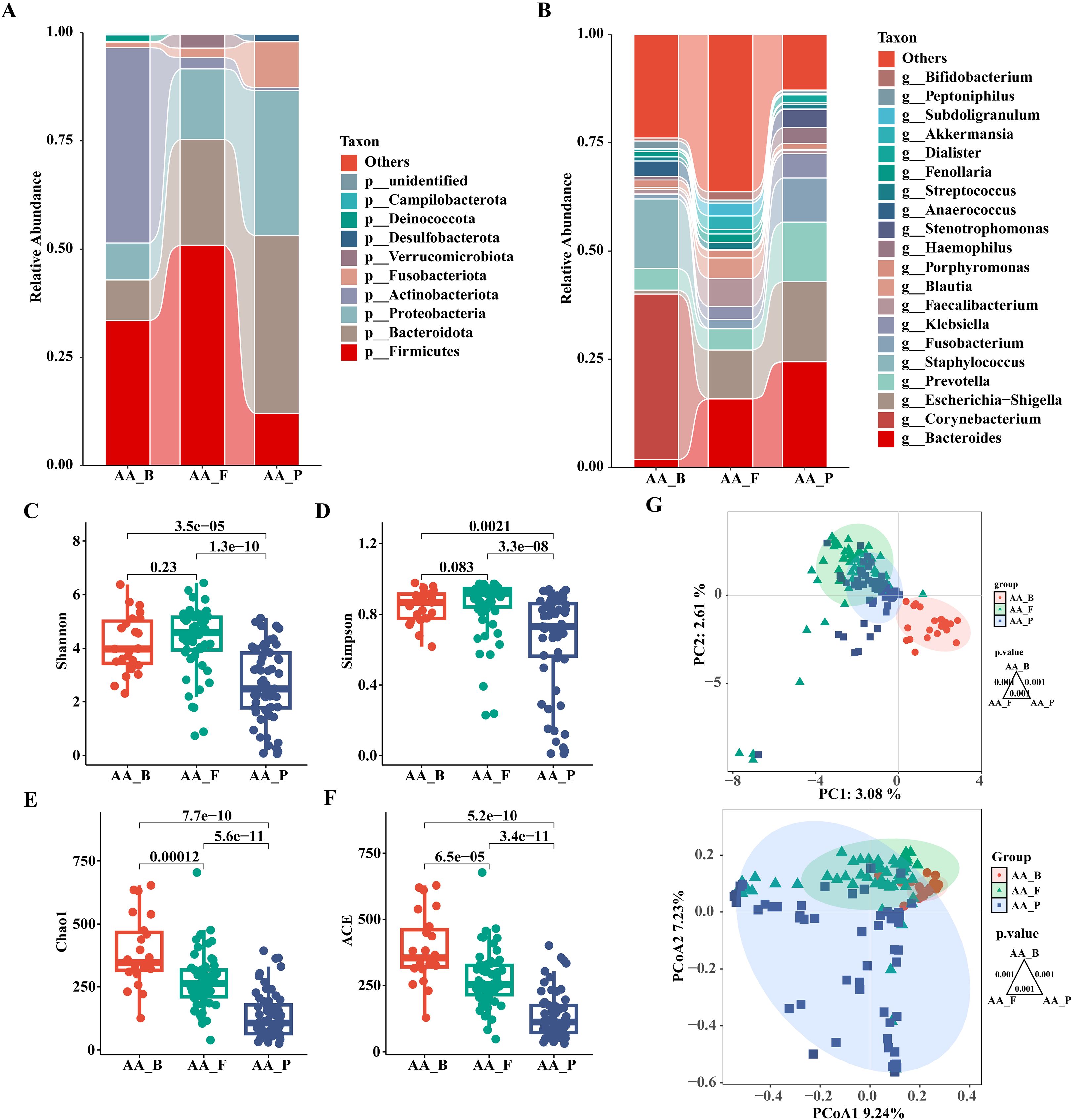 PCA and PCoA were used to assess β-diversity between groups to demonstrate differences in flora composition and distribution. As shown in Figure 5G, although there was a significant difference among the three groups (P=0.001, PERMANOVA), groups AA_F and AA_P were closer together and partially overlapped, indicating that they were more similar than group AA_B in terms of community composition and distribution.