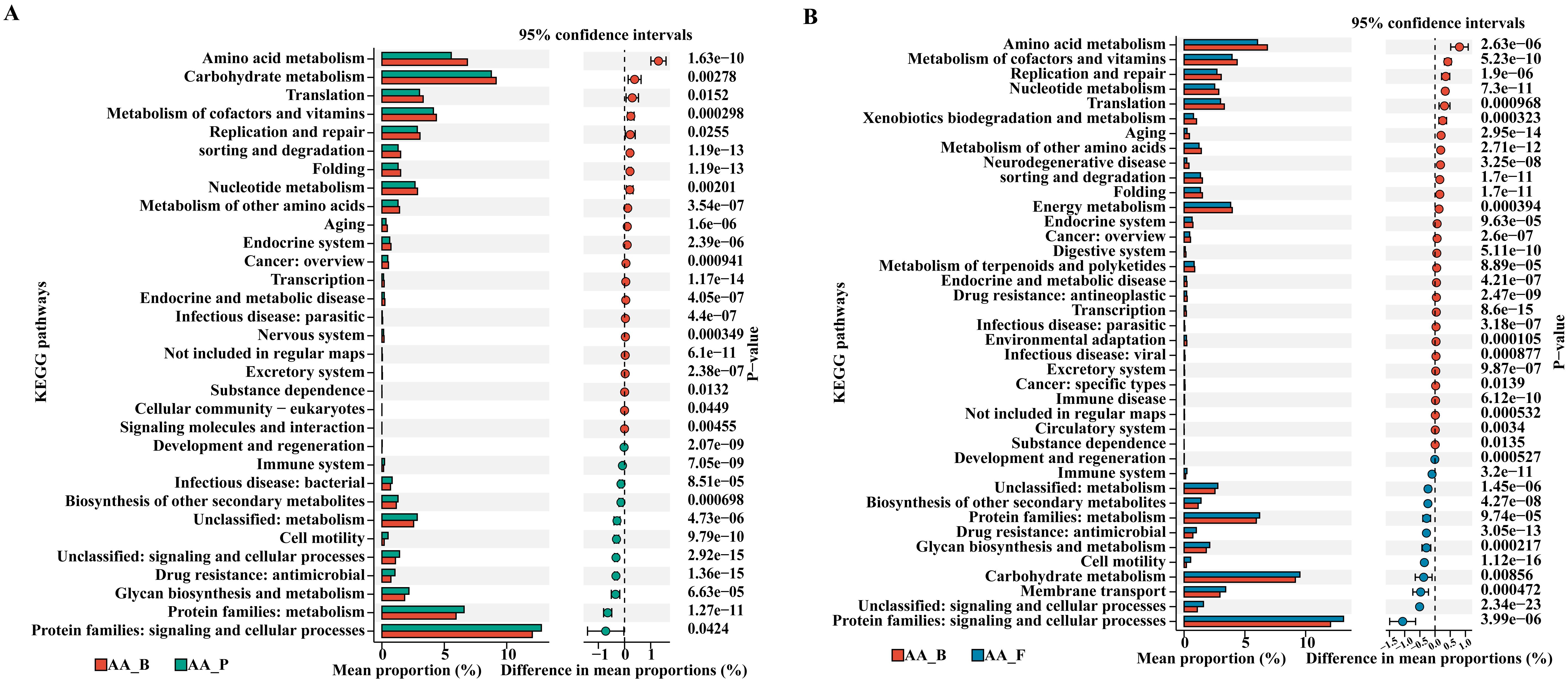 Figure 6. KEGG pathway enrichment analysis of AA_P and AA_F groups compared to AA_B group. (A) Between groups AA_B and AA_P. (B) Between groups AA_B and AA_F. KEGG, Kyoto Encyclopedia of Genes and Genomes. AA_B, perianal buttock skin flora group. AA_P, pus flora group. AA_F: gut microbiota group. (P< 0.05, Wilcoxon rank sum test).