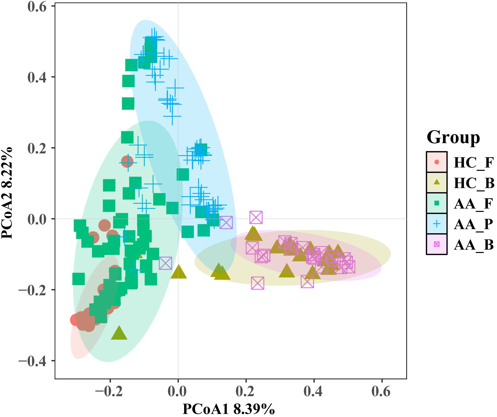 Figure 7. Principal coordinates analysis (PCoA) of microbial community composition across the five sample groups. HC_F, gut microbiota in the healthy control group. HC_B, perianal buttock skin flora in the healthy control group. AA_F, gut microbiota in the anorectal abscess group. AA_P, pus flora in the anorectal abscess group. AA_B, perianal buttock skin flora in the anorectal abscess group. Pairwise group differences were tested by PERMANOVA, the Bonferroni-corrected significance threshold was set at P<0.005 (0.05/10 comparisons). Pairwise comparisons showed significant differences (P=0.001) for all pairs except HC_B vs AA_B (P=0.29).
