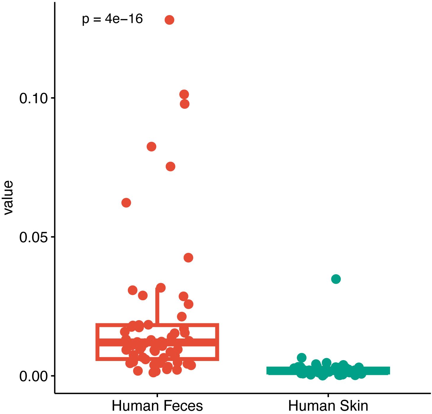 Fecal and perianal buttock skin samples were set as the source and pus as the target samples to be tested, and the contribution of the different source samples to the target samples was calculated to identify the microbial origins of the target samples and their relationships. The results showed that the proportion of microbial communities of fecal origin in the patient’s pus was significantly higher than that of perianal buttock skin origin, suggesting that the gut microbiota is the potential microbial origin of the anorectal abscess and plays a role in its development and progression (P< 0.001, Wilcoxon rank sum test) (Figure 8).