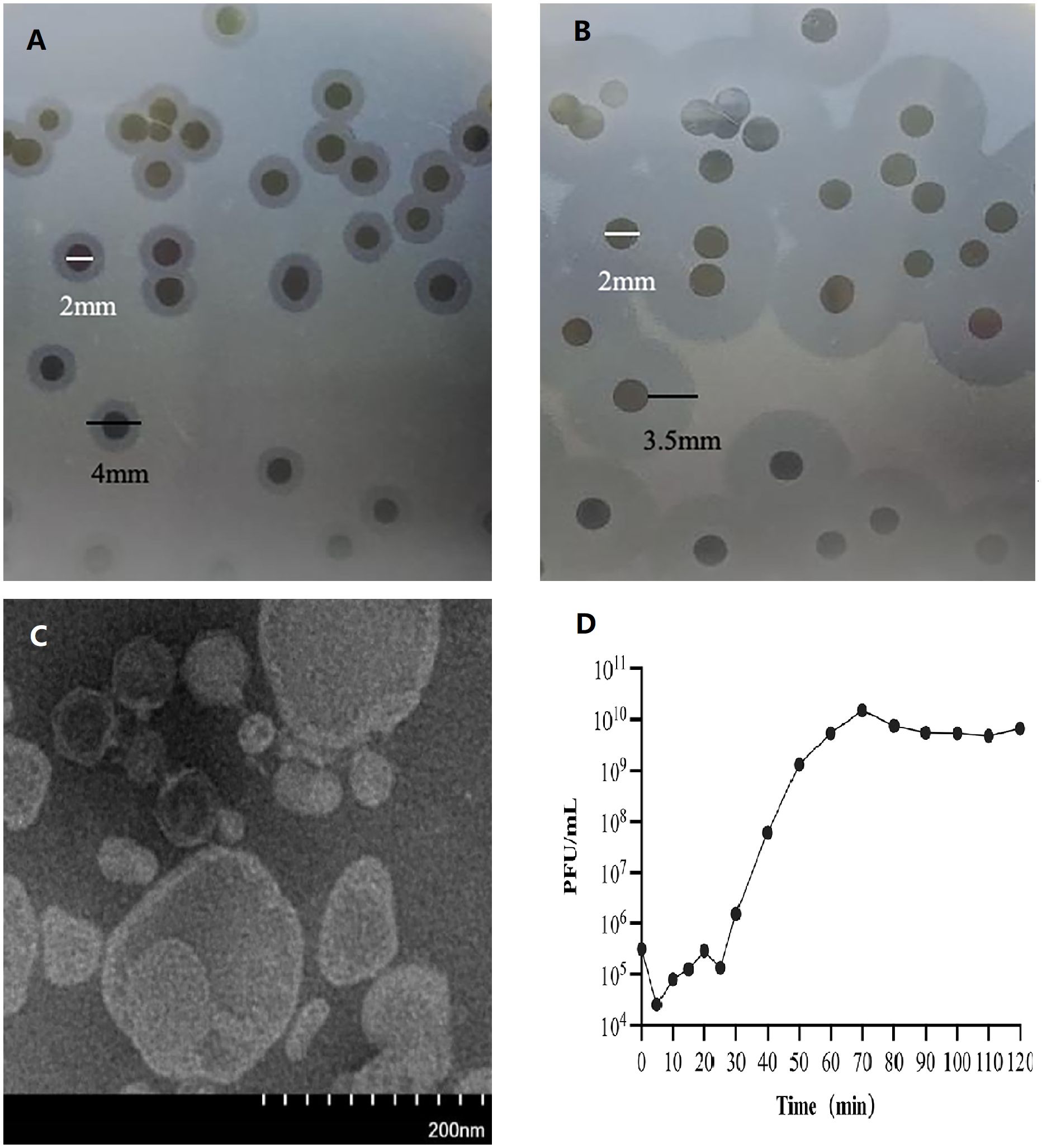 Figure 1. Transparent plaques and halos produced by bacteriophage 31Y. (A) Transparent plaques and halos were observed after 7 hours of cultivation. (B)Transparent plaques and halos were observed after 20 hours of cultivation. A semi-transparent halo expanded with prolonged incubation time. (C) Transmission electron micrograph of bacteriophage 31Y. (D) One-step growth curve of bacteriophage 31Y.