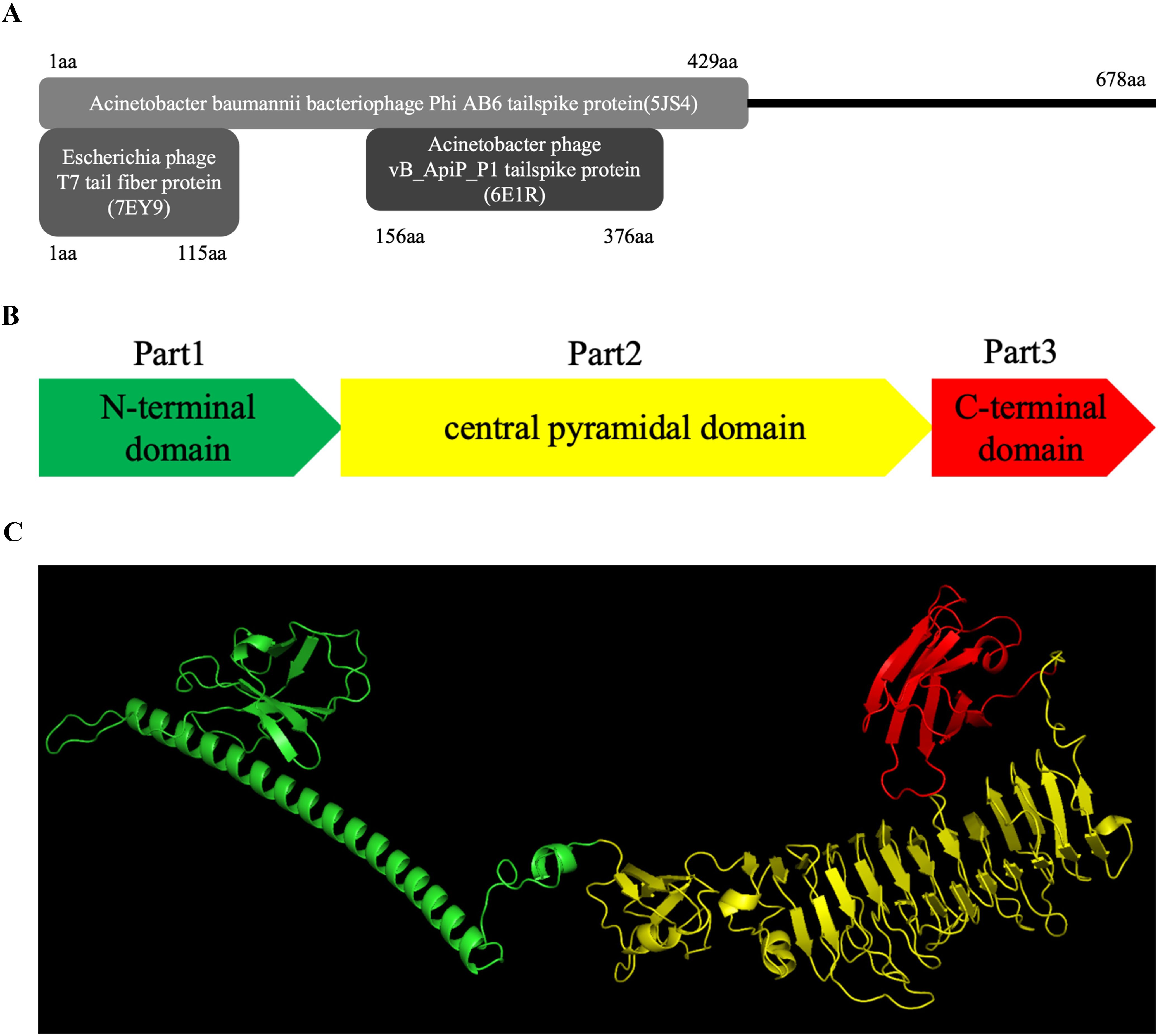 Among these ORFs, ORF43 with a size of 678 amino acids, was identified as the gene encoding the tail spike protein as it showed high homology with tail spike proteins of several Acinetobacter phages, such as Acinetobacter phages Paty (QQM15083), Acinetobacter phage vB_AbaP_ABW311 (CAL1776920) and Acinetobacter phage Pipo (QQO92973). These proteins are classified as structural depolymerases originating from these bacteriophages. Although no conserved domains could be found by NCBI Conserved Domain Search, HHpred analysis indicated high structural similarity between the N-terminal region of 31TSP to the N-terminal region of tail fiber/spike protein of the T7 phage (Garcia-Doval and van Raaij, 2012) and A. baumannii bacteriophage AB6 (Figure 2A).