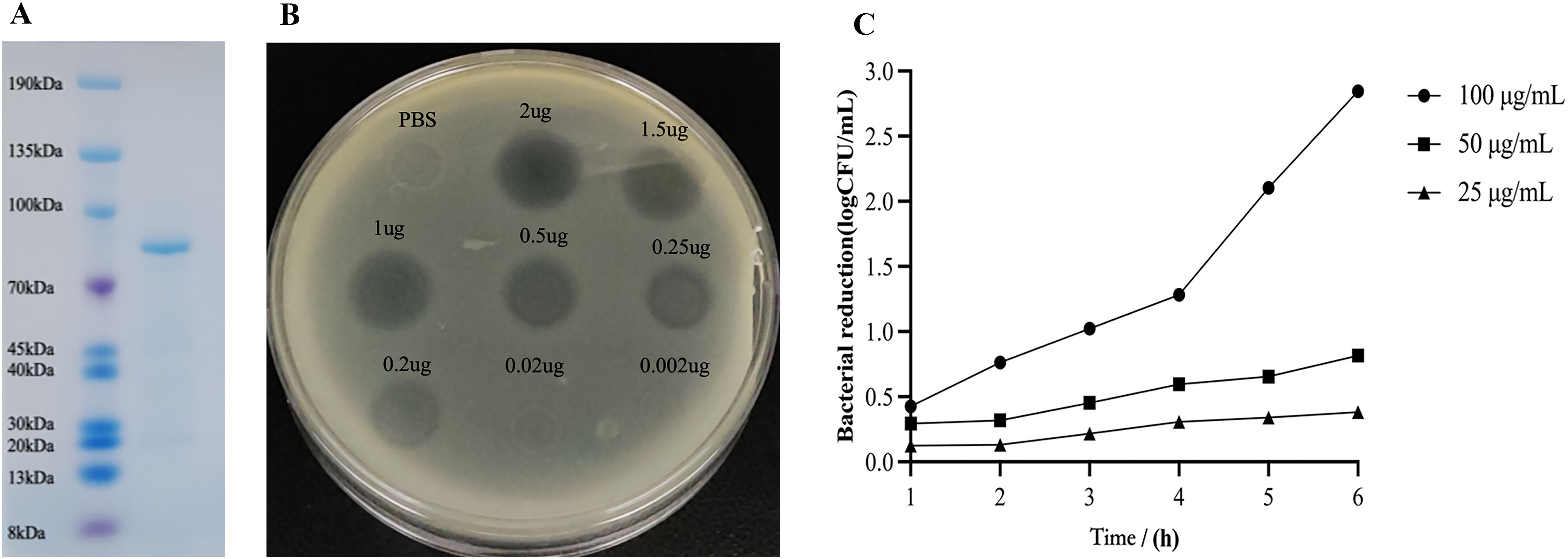 The gene ORF43, encoding the tail spike protein, was cloned into an expression vector and purified through Ni-NTA affinity chromatography, yielding a recombinant product at 223 µg/mL concentration. SDS-PAGE analysis confirmed the presence of a recombinant protein, 31TSP, with an approximate molecular weight of 75 kDa (Figure 3A). As the total number of amino acids in the protein sequence was 678, the purified protein band observed on the gel corresponds to a depolymerase monomer. To validate the enzyme’s activity post-purification, a plaque assay was conducted. For every test, 5 μL depolymerase in different concentration were dropped on bacteria lawn. The results demonstrated that purified 31TSP formed a semi-transparent halo on the lawn of host strain Ap31 (Figure 3B). The area of the semi-transparent halo decreased with decreasing concentrations of 31TSP, disappearing when the total amount of the enzyme spotted onto the bacterial lawn was reduced to 0.02 µg (4 µg/mL). Antibacterial activity experiments indicated a proportional relationship between 31TSP concentration and antibacterial efficacy. The most significant reduction in bacterial count was observed at a concentration of 100 μg/mL (Figure 3C). Thus, 31TSP exhibited robust depolymerase activity. However, the group treated with imidazole at the same concentration as the experimental groups showed no antibacterial effect. Please refer to Supplementary Figure 1 for the results.