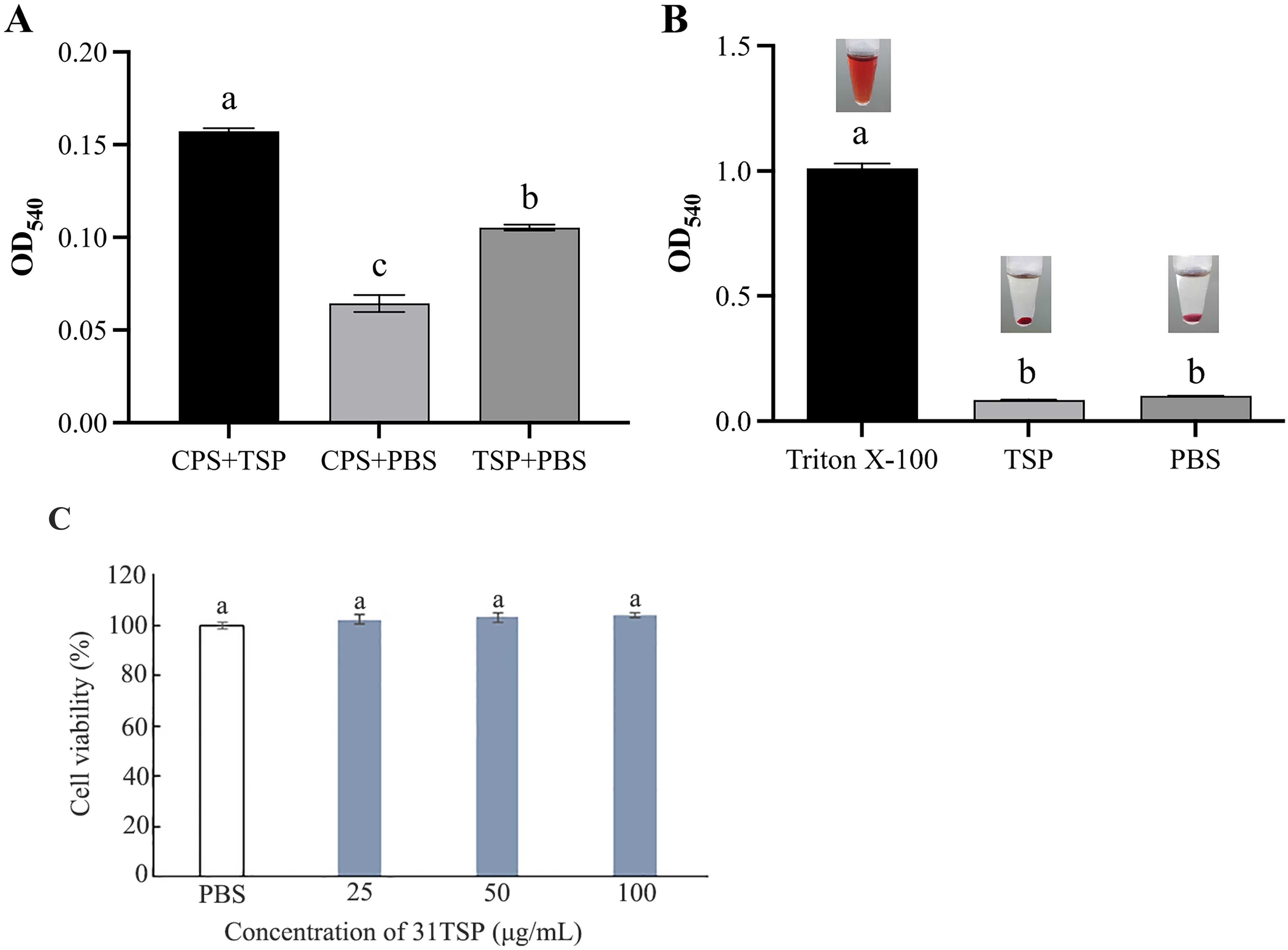 Panel A shows a bar graph of optical density (OD) at 540 nm for CPS with TSP, CPS with PBS, and TSP with PBS. CPS with TSP has the highest OD reading, marked 'a', followed by TSP with PBS 'b', and CPS with PBS 'c'. Panel B presents OD measurements for Triton X-100, TSP, and PBS, with Triton X-100 showing significantly higher OD marked 'a', and both TSP and PBS showing lower readings marked 'b'. Insets show images of solution colors. Panel C illustrates cell viability percentages treated with PBS and varying concentrations of TSP, all labeled 'a' indicating similar viability results.