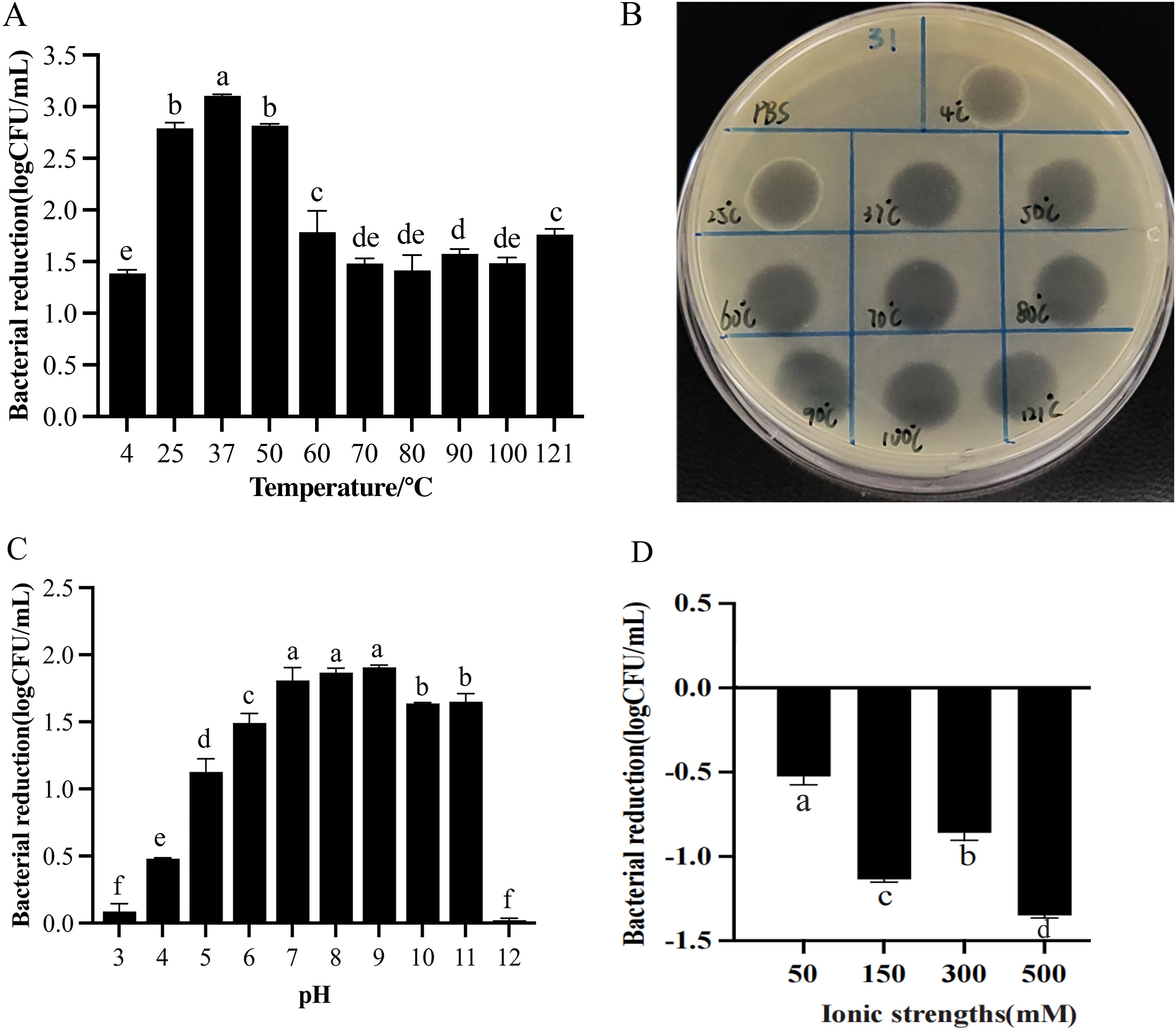 Chart A illustrates bacterial reduction across various temperatures, with the highest reduction at 37 degrees Celsius. Image B shows a petri dish divided into sections labeled with different temperatures. Chart C presents bacterial reduction at different pH levels, peaking between pH 6 and 9. Chart D depicts bacterial reduction in relation to increasing ionic strengths, with greater reduction at higher concentrations.