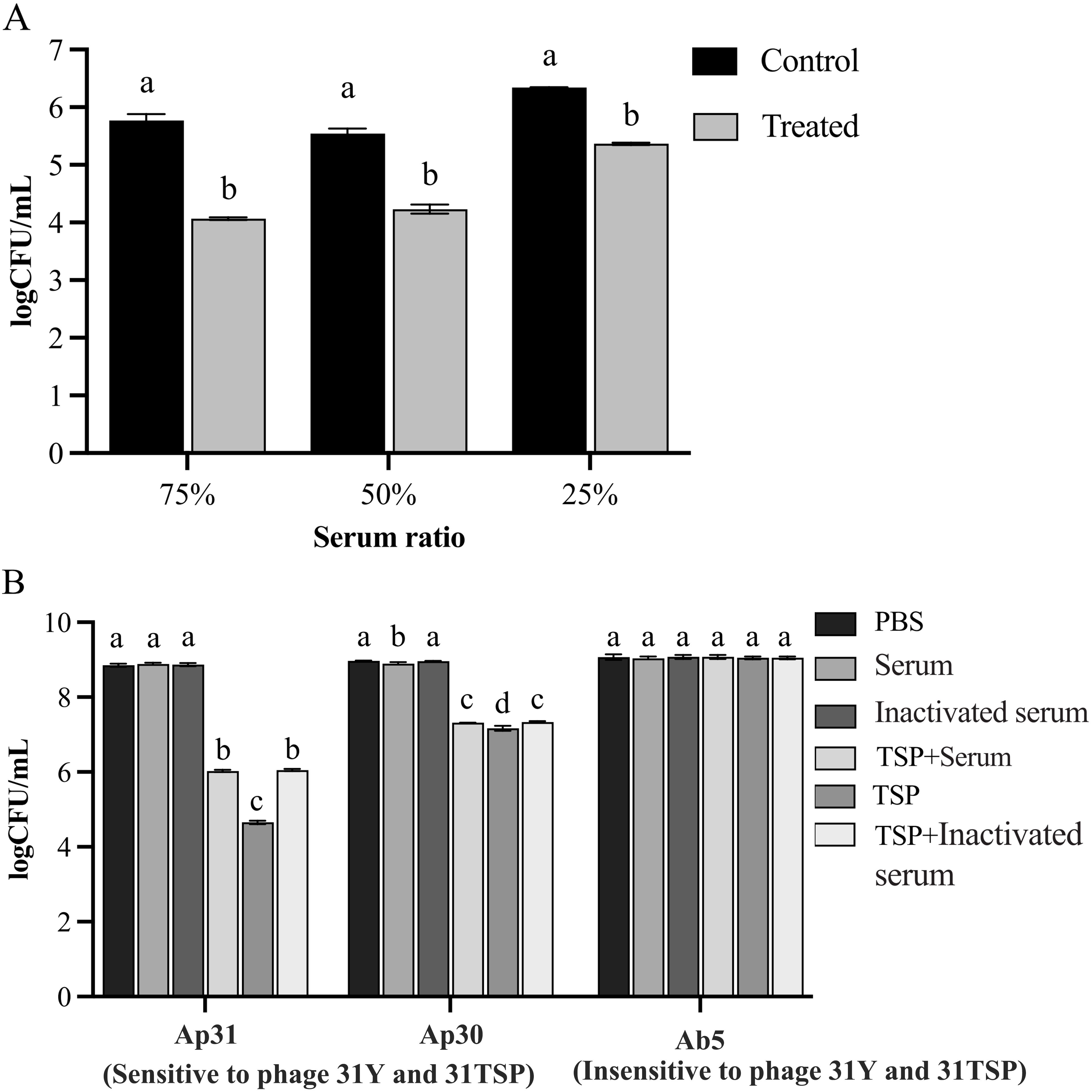 Two bar graphs depict bacterial growth measured in log CFU per milliliter under different conditions. Graph A shows control and treated samples at serum ratios of 75%, 50%, and 25%, with controls generally having higher growth. Graph B compares PBS, serum, inactivated serum, TSP plus serum, TSP, and TSP plus inactivated serum conditions across Ap31 (sensitive to phage 31Y and 31TSP), Ap30, and Ab5 (insensitive to phage 31Y and 31TSP) strains. The legend differentiates graph categories and treatments. Both graphs indicate varying levels of bacterial growth with annotations (a, b, c, d) marking statistical differences.
