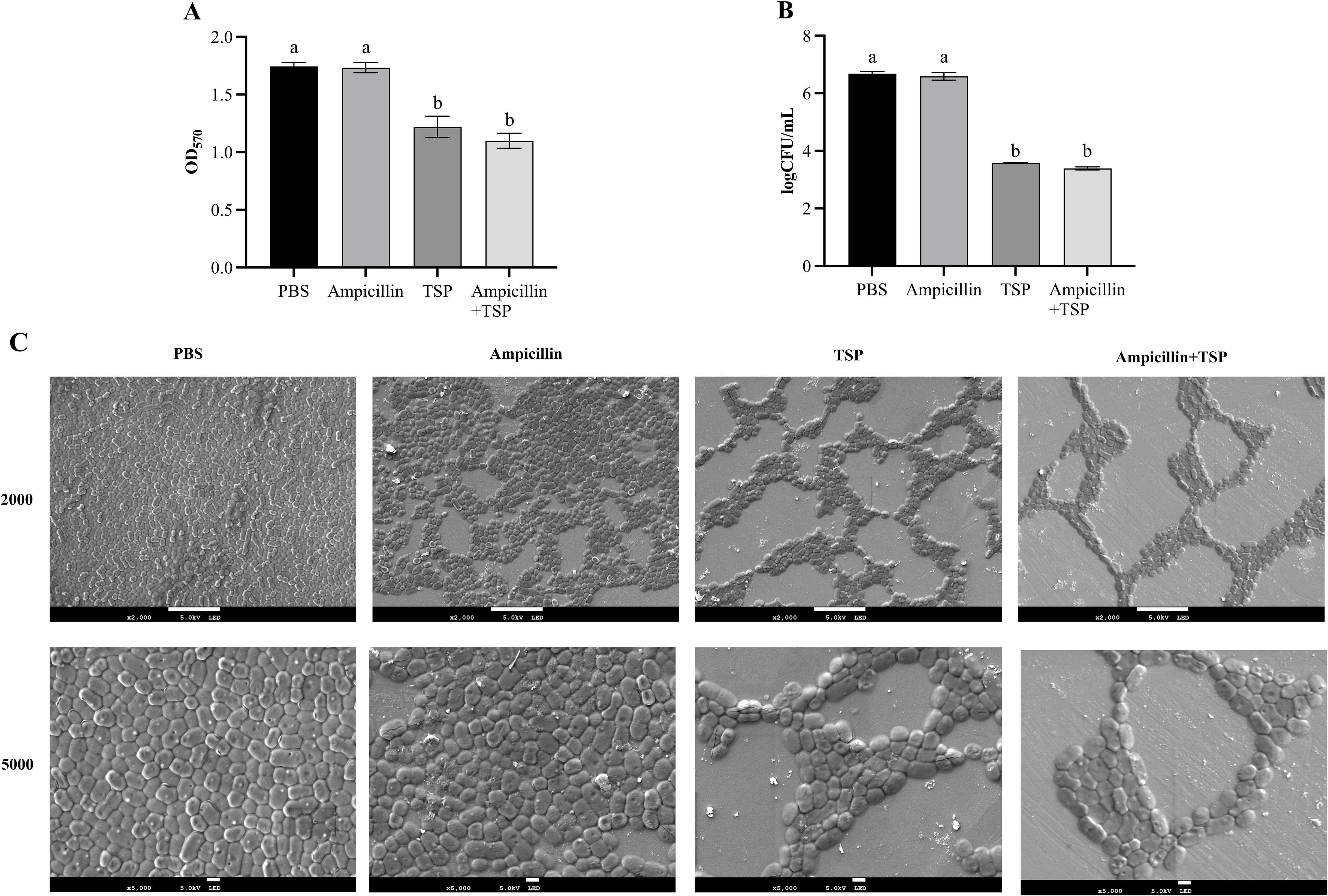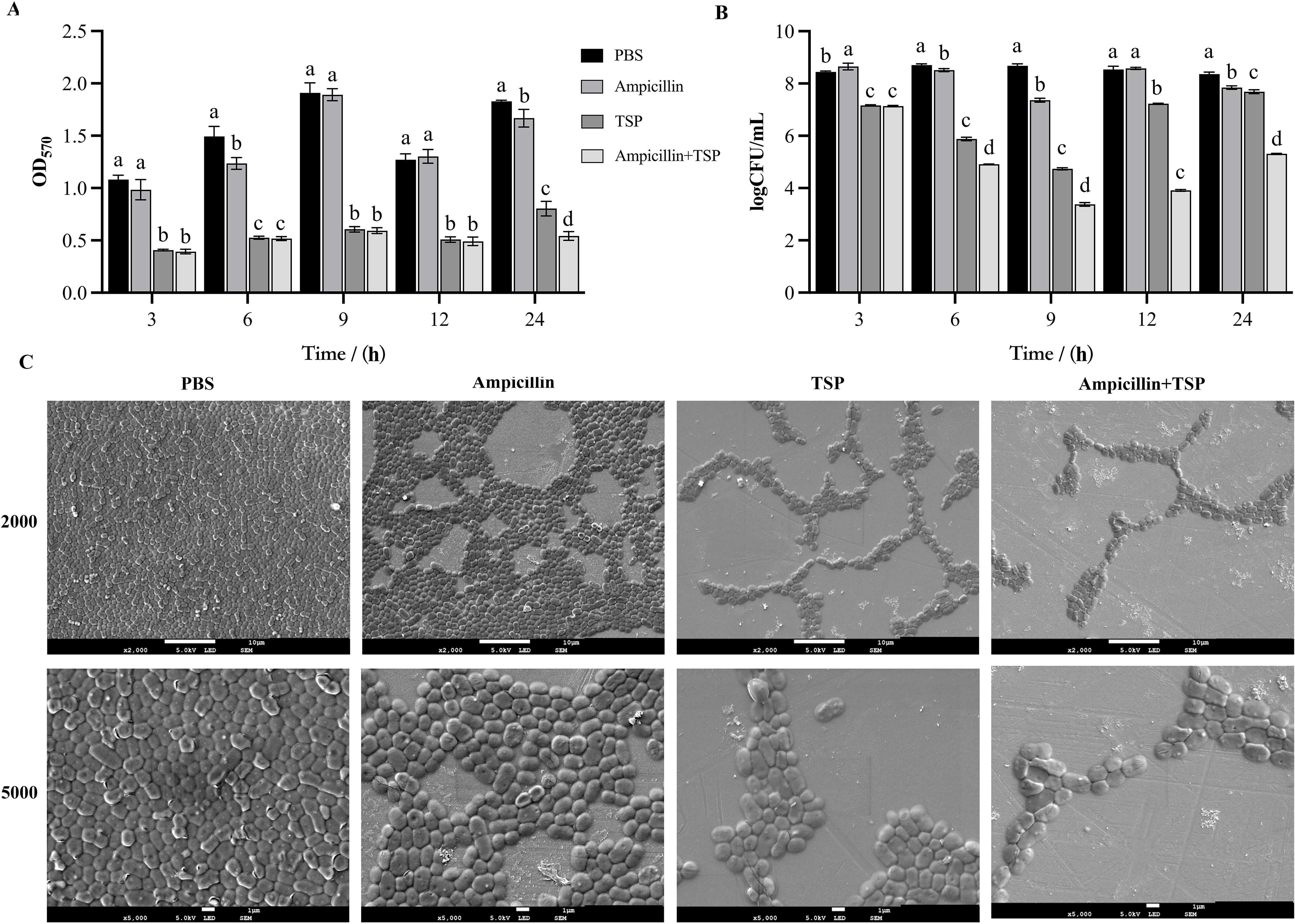 As previously described, we investigated the inhibitory effects of 31TSP and antibiotics on biofilm, with slight modifications (Chen et al., 2022). The host bacterium Ap31 was cultured to the logarithmic phase, treated with 0.1M PBS (control group), 31TSP (100 μg/mL), ampicillin (16 μg/mL, MIC), or their combination (31TSP + ampicillin) at a final volume of 100 μL/well in a 96-well plate, and incubated at 37°C for 3h, 6h, 9h, 12h, and 24h, respectively. After incubation, all culture media were removed, and the wells were washed three times with 100 μL of 0.1M PBS. The plate was air-dried at room temperature, stained with 100 μL of 0.1% (w/v) crystal violet for 10 min, and then destained with 100 μL of 95% ethanol for 10 min. The remaining biofilm biomass was quantitatively measured at 570 nm wavelength using a microplate reader (BioTek). The anti-biofilm activity was assessed by counting planktonic live bacteria (Wilson et al., 2017). All experiments were independently conducted three times.