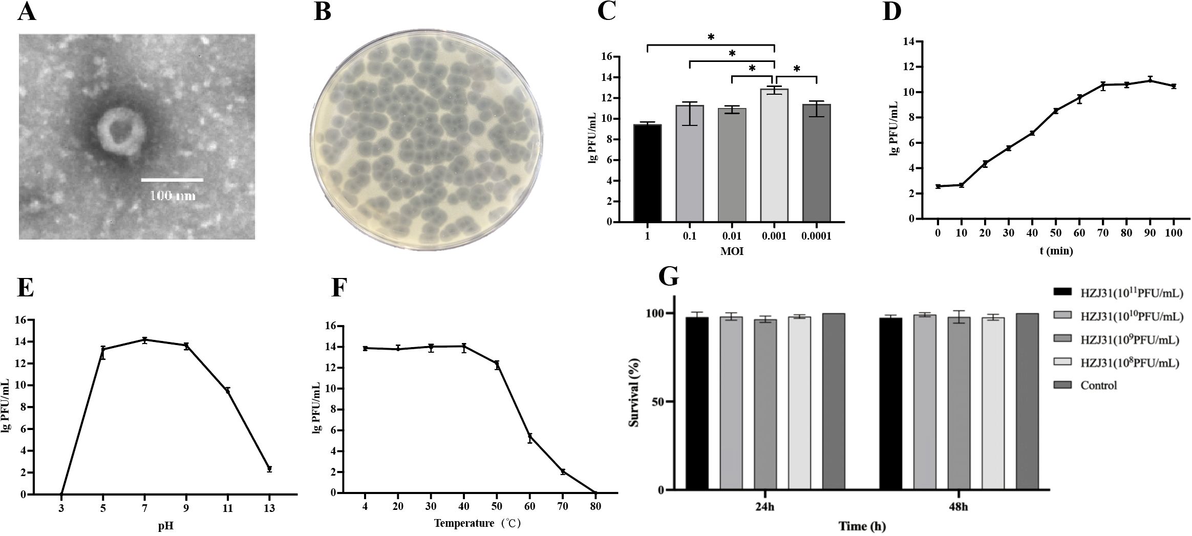 Figure 1. Biological characteristics, stability and cytotoxicity of phage HZJ31. (A) TEM morphology of phage HZJ31, revealing an icosahedral head (~80 nm) and short tail (~10 nm), consistent with Caudovirales. (B) Plaque morphology of phage HZJ31 on a double-layer agar plate. (C) The optimal MOI of phage HZJ31, the highest titer was observed at MOI = 0.001, mean ± SD. (D)The one-step growth curve of phage HZJ31, mean ± SD. (E) The pH stability of phage HZJ31, the phage remained stable between pH 5–9 but was inactivated under extreme acidic or alkaline conditions. mean ± SD. (F) Thermal stability of phage HZJ31. phage activity was maintained up to 50 °C and declined at higher temperatures, with complete inactivation at 80 °C. mean ± SD. (G) Cytotoxicity assessment of phage HZJ31 on THP-1 cells by CCK-8 assay. no significant cytotoxicity was observed after 24 h and 48 h exposure to phage HZJ31 at various concentrations (108 to 1011 PFU/mL). mean ± SD. *P < 0.05.