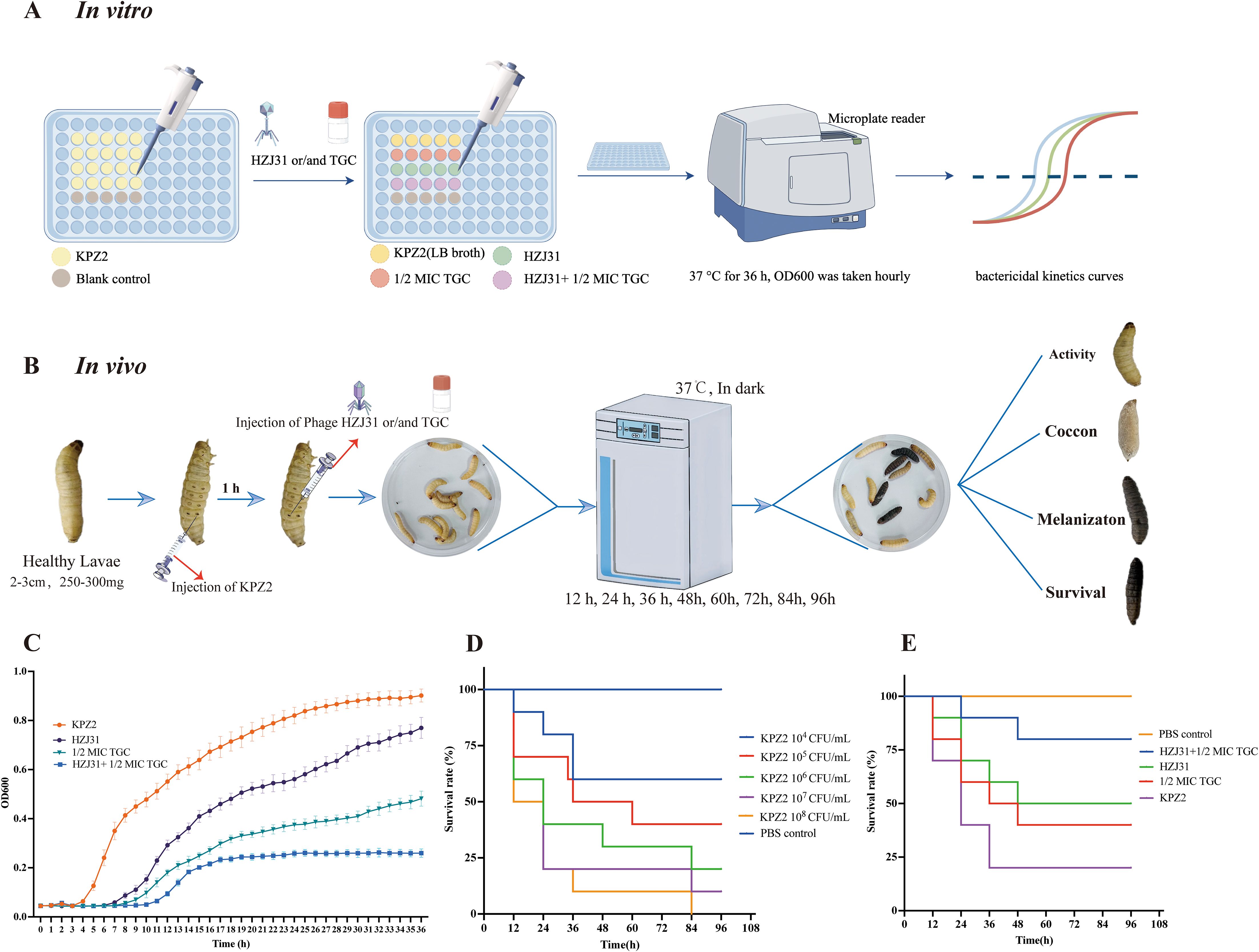 Figure 3. Antibacterial efficacy of phage HZJ31 and TGC against KPZ2 in Vivo and in Vitro. (A) Schematic of the in vitro bactericidal kinetics assay. KPZ2 was cultured in a 96-well plate and treated with phage HZJ31 (MOI = 0.001), 1/2 MIC TGC, or their combination. OD600 values were measured hourly over 36 hours at 37 °C using a microplate reader to generate bactericidal kinetics curves. (B) Schematic of the bactericidal efficacy in the G.mellonella infection model. Larvae were injected with KPZ2 (10 μL) into the last left proleg and incubated for 1 h, followed by injection of phage HZJ31, 1/2 MIC TGC, or their combination into the last right proleg. Larvae were monitored at 12-h intervals for survival over 96 hours. (C) In vitro bactericidal activity of phage HZJ31 and TGC against KPZ2 strain, mean ± SD. (D) Survival curves of G.mellonella larvae injected with different concentrations of KPZ2 to determine the optimal bacterial inoculum. An inoculum of 1×107 CFU/mL resulted in approximately 80% mortality at 24 h, mean ± SD. (E) Therapeutic efficacy of HZJ31 and TGC in G.mellonella infection model, mean ± SD.